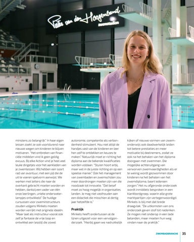 autonomie, competentie als verbondenheid stimuleert. Hou niet altijd de handjes vast van de kinderen en leer hen zelf te ontdekken en keuzes te maken.” Natuurlijk moet er richting het diploma aan de bekende kwalificaties worden voldaan. “Sturen hoort erbij, maar wel in de juiste richting en op een speelse manier.” Ook het management van zwembaden en zwemscholen zou meer doordrongen moeten zijn van die noodzaak tot innovatie. “Dat besef moet zo hoog mogelijk in organisaties landen. Je mag niet vasthouden aan een didactiek die misschien al dertig jaar hetzelfde is.”
