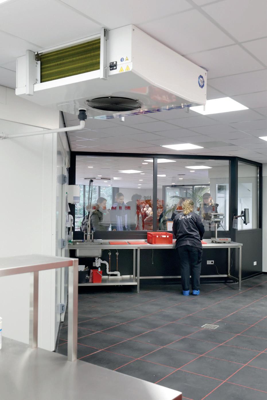 Voorwaarde voor goed zicht op de keuken en de koelingen, is natuurlijk dat de ramen niet beslaan. “Dat vond ik wel even spannend, maar onze leverancier heeft vakwerk geleverd,” aldus Remco. Die leverancier, dat is DI Koeltechniek. Het bedrijf verzorgde al het onderhoud van de koelingen en vriezers en werd gevraagd de koel- en vriesinstallatie te plaatsen voor de nieuwe keuken. Geen alledaagse klus, vertelt directeur Jan Willem Mol: “De locatie maakte dit al een bijzonder project. Bovendien mochten we hier het complete plaatje doen: behalve de koel- en vriesinstallatie hebben we ook de klimaatinstallatie, een systeem voor luchtcirculatie en een warmteterugwinningsysteem voor het tapwater gerealiseerd – mogelijk later ook voor andere doeleinden. En nee, nooit eerder hebben we koelcellen met zoveel ramen geplaatst.” Voor de ventilatie wordt een kruisstoomwisselaar gebruikt, die de warmte vanuit de vervuilde binnenlucht ventileert met een rendement van 80 – 90%. “Die stond niet op ons lijstje, want het is een flinke