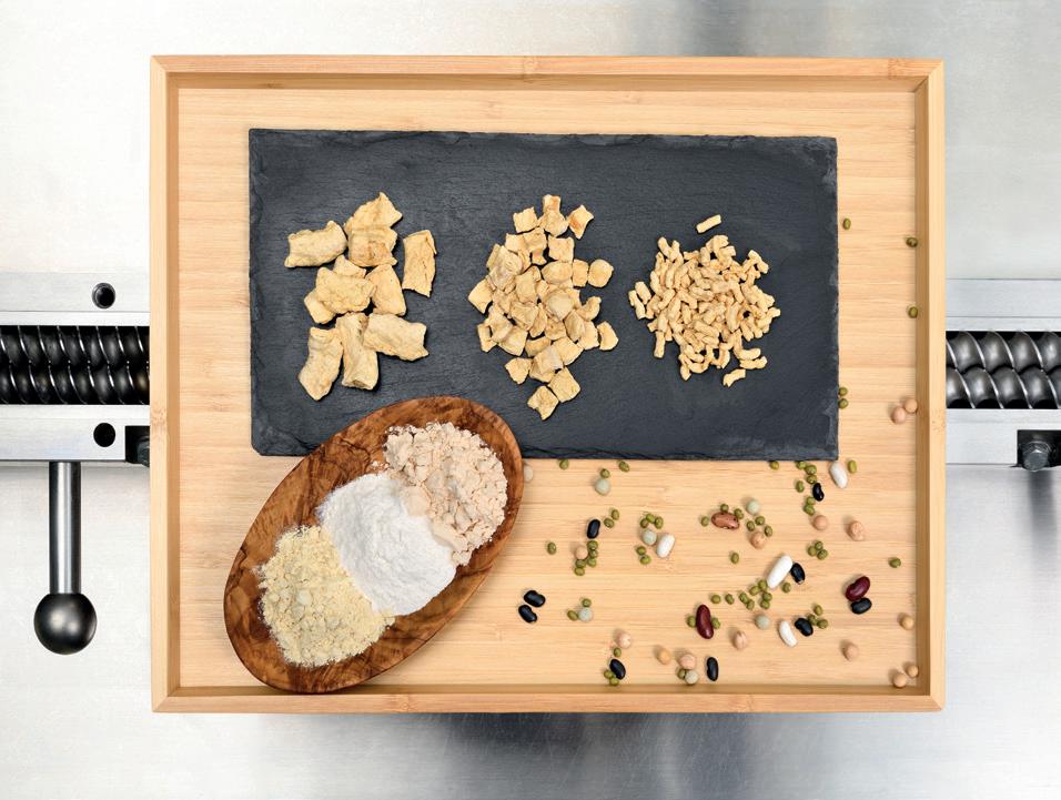 Uit eiwitrijke peulvruchten (rechtsonder) worden eiwitpoeders (linksonder) geëxtraheerd, waarvan door middel van extrusie TVPs in verschillende vormen en maten (middenboven) worden gemaakt.