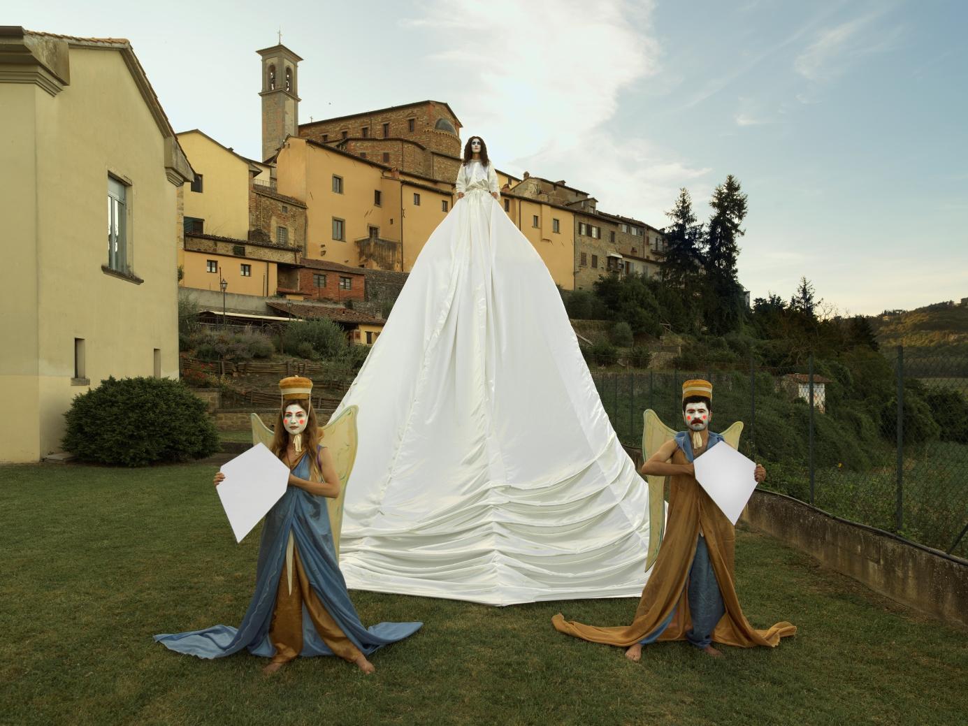A Monterchi, al Museo della Madonna del Parto, dopo aver osservato l'equilibrio perfetto dell'immagine pierfrancescana custodita all'interno, sempre uno alla volta, ci siamo spinti lungo un corridoietto esterno e laterale che si apre d'improvviso su una terrazza erbosa che domina una buona parte della Valtiberina e lì, tenendo come sfondo il borgo di Monterchi, ci è apparsa la composizione unitaria di un'altissima madonna, issata forse su una scala, forse sui trampoli (non si vedeva perché tutto era coperto dal lungo abito bianco), ai cui piedi stazionavano due angioletti dai volti terrigni, con gli occhi bistrati e il volto coperto di biacca – a noi è venuto da pensare che avessero un'aria pasoliniana –, muniti di specchi su cui si rifletteva il volto di ogni spettatore.