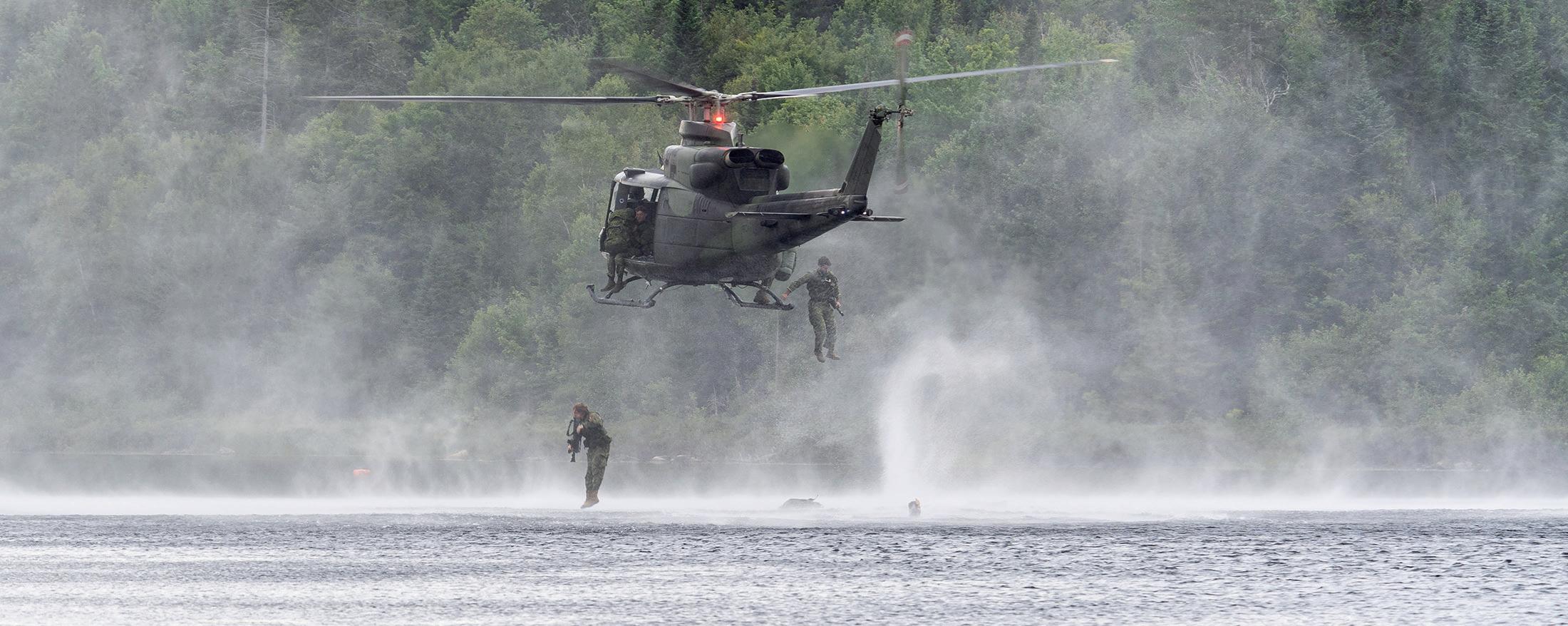 Ces militaires canadiens appartenant au Groupement tactique multinational de l'OTAN Lettonie sont photographiés lors d'un entraînement d'insertion aérienne, accrochés en grappe à un CH-146 Griffon, dans le cadre de l'Exercice RAVEN AMPHIBIOUS, le 28 août dernier.