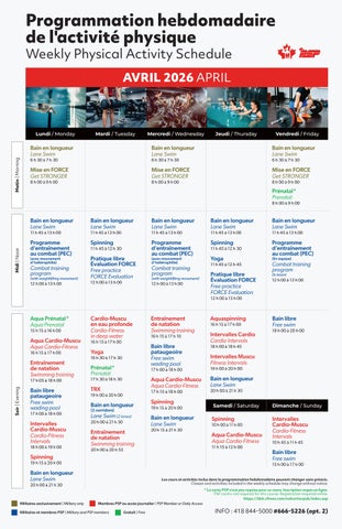 Les cours et activités inclus dans la programmation hebdomadaire peuvent changer sans préavis.