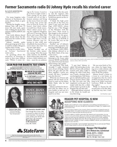He was soon back in Tucson, where he began hanging out at radio stations and making acquaintances with some of the disc jockeys. Johnny found a home in a room at a rest home, an arrangement that he noted worked out fine for him, as long as he “didn’t interrupt Lawrence Welk on Saturday nights.� While in Tucson for the second time in his life, Johnny lied his way into a midSee Broadcast, page 7