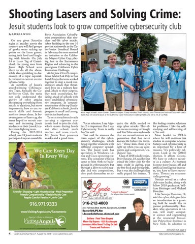 Force Association CyberPatriot competitions that simulate real-life cyber attacks. After finishing in the top 10 percent nationwide at the CyberPatriot Semifinal Round in February, the teens received an invitation to the California Mayors Cyber Cup, placing first in the Sacramento Region and advancing to the prestigious California Cyber Innovation Challenge. At the June 23 to 25 competition held at Cal Poly in San Luis Obispo, the teens worked together to stop a mock ransomware attack that threatened lives on a military hospital. Much to their surprise, they took second-place, finishing ahead of schools with more established cybersecurity programs. In comparison to some of the top Southern California schools, Jesuit’s program is small and young, only in its fourth year. To entice students already carrying a rigorous academic load to join the club, which meets during lunch and after school, math teacher and team coach, Mr. Justin Tsai, promises snacks and a good time.