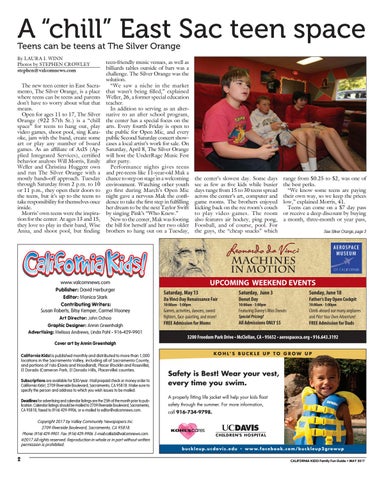 www.valcomnews.com Publisher: David Herburger Editor: Monica Stark Contributing Writers: Susan Roberts, Bitsy Kemper, Carmel Mooney Art Director: John Ochoa Graphic Designer: Annin Greenhalgh Advertising: Melissa Andrews, Linda Pohl - 916-429-9901 Cover art by Annin Greenhalgh California Kids! is published monthly and distributed to more than 1,000 locations in the Sacramento Valley, including all of Sacramento County, and portions of Yolo (Davis and Woodland), Placer (Rocklin and Roseville), El Dorado (Cameron Park, El Dorado Hills, Placerville) counties. Subscriptions are available for $30/year. Mail prepaid check or money order to California Kids!, 2709 Riverside Boulevard, Sacramento, CA 95818. Make sure to specify the person and address to which you wish issues to be mailed. Deadlines for advertising and calendar listings are the 25th of the month prior to publication. Calendar listings should be mailed to 2709 Riverside Boulevard, Sacramento, CA 95818, faxed to (916) 429-9906, or e-mailed to editor@valcomnews.com. Copyright 2017 by Valley Community Newspapers Inc. 2709 Riverside Boulevard, Sacramento, CA 95818. Phone: (916) 429-9901. Fax: (916) 429-9906. E-mail:calkids@valcomnews.com. ©2017 All rights reserved. Reproduction in whole or in part without written permission is prohibited.