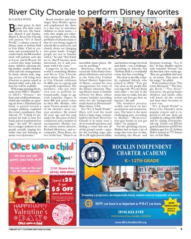 Grammy-winning, “Let It Go.” In fact, Muther said he only watched “Frozen” for the first time a few weeks ago. “But my grandkids had seen it, of course. They knew all the songs,” he added. With numbers from “The Little Mermaid,” “The Jungle Book,” “Toy Story” and more, the group hopes children and adults alike will know all the words and hear their favorites in a new way. “It’s A Small World” is River City Chorale’s most popular concert and is expected to sell out. Seats are available by calling 331-5810 and by visiting rivercitychorale.org. Tickets cost $25 for general admission and $15 for children ages 5 to 12. Serbian Hall is located at 777 Sunset Ave. in Fair Oaks.