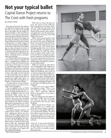 Bean bags and toys for the audience one night and a hip hop artist on stage the next are not what you’d typically find at the ballet, but the August 25, 26 and 27 ballets at The Crest Theatre will not be your typical performances with your typical audiences. In partnership with the Sacramento Kings and the Kings Foundation, Capital Dance Project will present A Sensory-Friendly Performance on Friday, August 25 for families with special needs children, such as those with Autism. The following two days showcase the return of Behind the Barre: Made in Sacramento. Dancers will debut nine pieces created in collaboration with Sacramento artists, including painters, photographers and musicians. For Friday’s ballet, the bean bags and toys come into play in a planned safe space – a designated area children can retreat to if they need a break from the performance. If the music is too loud or overwhelming, children can slip on headphones and continue to enjoy the dancing in quiet from their seats. The idea is to make the theater welcoming to those who might not feel welcome at a live performance due to audience members who might shush them or sounds that might upset them, explained Alexandra Cunningham, cofounder of Capital Dance Project. “It’s important to us to be inclusive. Our job as artists is to make art accessible,” said Cunningham. That accessibility is part of CDP’s mission to uplift the Sacramento community through performing arts – a mission established when the 2015 Sacramento Ballet season was cut short by three weeks and the dancers needed a way to pay rent. According to dancer and choreographer Christopher Nachtrab, the dancers had long talked about starting their own collective. The layoff “lit a fire under us and forced and us to put our money where our mouth is.” The dancers banded together, and Capital Dance Project, an independent, collaborative dancer-run company, took off at allegro speed. From marketing to managing and from costuming to choreographing, the dancers do it all. The collaborative effort allows dancers to showcase their many talents while also developing skills that will open doors for them when dance careers end “way down the line when our bodies are no longer willing,” explained Nachtrab. Valley Community Newspapers, Inc.