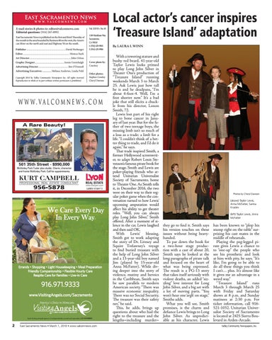 has been known to “plop his stump right on the table” surprising his cast mates in the middle of rehearsals. Playing the peg-legged pirate gives Lewis a chance to to “one-up” the people who see his prosthetic and look at him with pity, he says. “It’s like, I’m going to be able to do all these things you think I can’t… plus. It’s almost like it gives me an advantage in a weird way.” “Treasure Island” runs March 3 through March 25 with Friday and Saturday shows at 8 p.m. and Sunday matinees at 2:30 p.m. For ticket information, call 916521-1032. Unitarian Universalist Society of Sacramento is located at 2425 Sierra Boulevard in Arden-Arcade. Valley Community Newspapers, Inc.