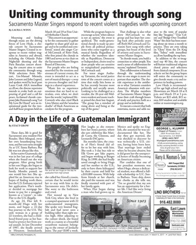 March 18 and 19 at First United Methodist Church. “This concert is an opportunity for the community to gather together to share grief and anger and to be soothed and comforted,” stated alto singer Carol McCormick of River Park, who first joined the chorale in 1983 and serves as vice chair on the Sacramento Master Singers Board of Directors. For people who are feeling unsettled by the tensions and stresses of current events, the event is intended to act as a sort of musical therapy – a way to process thoughts and feelings in a shared experience. “Music lets us experience emotions that are hard to articulate, even when we don’t have the words,” explained McCormick who also cited Black Lives Matter and the “senseless deaths” of black Americans as catalysts for the program.