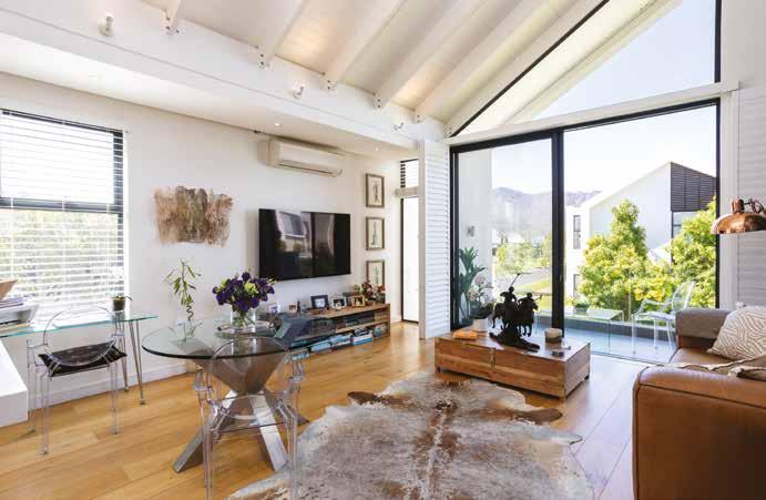 Estate. This four-bedroom home showcases modern fnishes, sophisticated design, and practical openplan living spaces. The expansive kitchen features a breakfast bar and a separate scullery, with convenient access to the garage. The open-plan living and dining area provides an inviting setting for family gatherings. The main bedroom offers a dedicated dressing area and a luxurious en-suite bathroom. Two of the bedrooms share a bathroom, while the fourth bedroom benefts from its own en-suite. Each bedroom is equipped with built-in wardrobes and air conditioning. Additional features of this property include a study nook, a 5kva inverter and battery backup system, a swimming pool with fence and a boma. PRICE: R10 995 000, INCL VAT