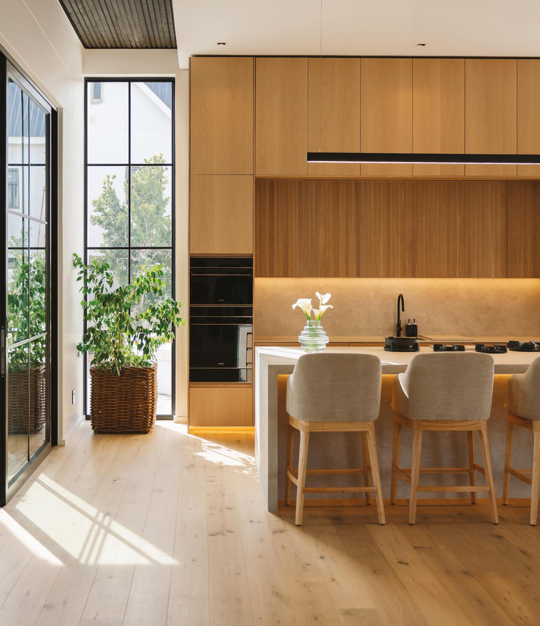 Set within the sought-after La Vue neighbourhood, this North-facing home combines sophisticated design, premium finishes and thoughtful craftsmanship. Spanning generous proportions, it presents an open-plan layout with meticulously selected details, including multiple living areas, soaring ceilings and expansive floorto-ceiling glass windows that fill the interiors with natural light. It includes a covered patio with a built-in braai, a sparkling swimming pool with a heat pump and automated cover and a landscaped garden that extends the living space outdoors. The state-of-the-art kitchen is fitted with premium integrated appliances such as a builtin fridge and freezer, dishwasher, wine cooler, ice machine and a high-end oven with gas hob and extractor. It also features a generous walk-in pantry and fridge. This exceptional home offers beautifully designed ensuite bedrooms, including a conveniently located ground-floor bedroom. A floating staircase ascends to the four upstairs bedrooms. The main bedroom has a spacious walk-in closet, a luxurious bathroom with top-tier finishes and an automated skylight that softens the space through daylight. Oggie engineered timber flooring adds a warm, elegant finish, while double-glazed doors and windows enhance privacy and energy efficiency. Comfort is further ensured with integrated air-conditioning and a slow combustion wood burner for year-round climate control. Sustainability is incorporated into the home’s design, with features such as an 8 000 litre underground rainwater harvesting tank, water purifier system, central hot water ring system for instant hot water and a solar, inverter and battery backup. PRICE: R33 500 000