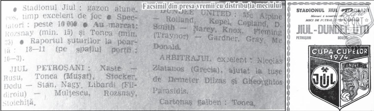 După turul din Scoția în C upa Cupelor, meci pierdut de Jiul cu 0-3 în fața celor de la Dundee Un ited, pe data de 2 octombrie 1974 se va disputa returul