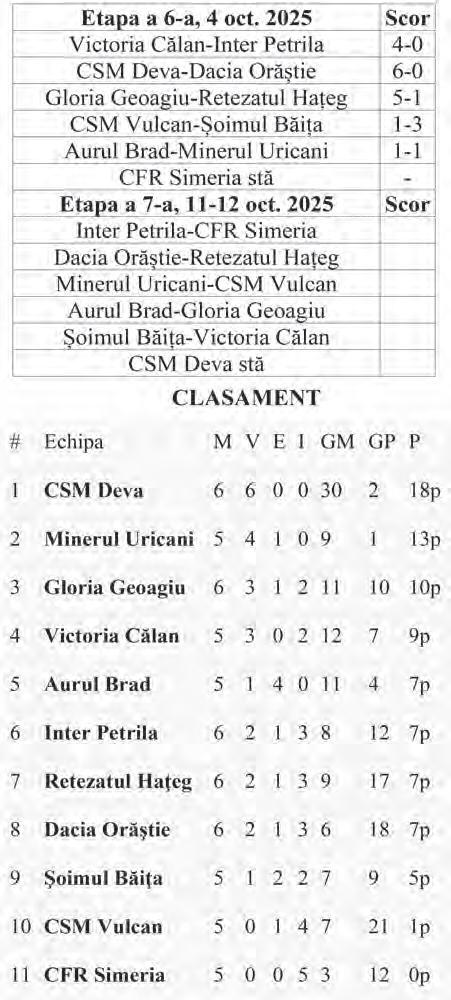Victoria Călan a „măturat” cu Inter Petrila, scor 4-0 Aurul Brad-Minerul Uricani 1-1 (0-0), după ce gazdele au condus cu 1-0 (gol Talpaș, min 49), uricăneni au egalat prin Prem (min. 57) echipa lui Mugurel Ciorâia continuă să surprindă în formula: Adr Farcaș (min 29 Bucșa)-Ciorâia, I Roșian, D Florea, D Androne-Prem, Al Buțurcă, A: Harangozo, Iepure-Ciocârlan, A Rus (min 70 Hatmanu)