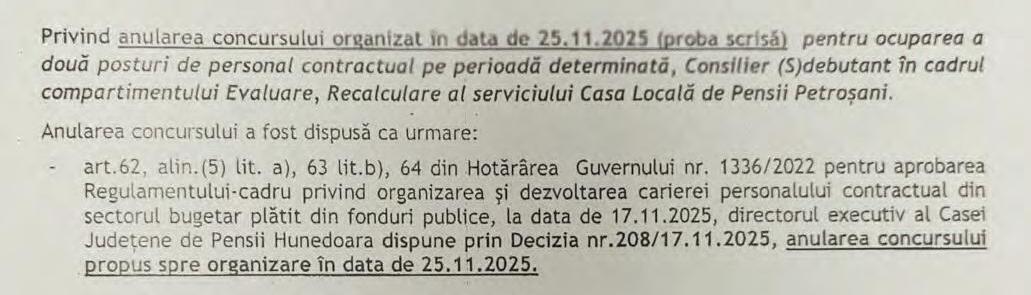 anu area concursului din 25 noiembrie, când urma să a bă loc proba scr să, pentru ocuparea a două postur de personal contractua pe perioadă determinată, în cadrul Compart mentului