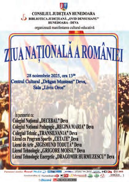 Bib ioteca Judeţeană „Ovid Den usianu” Hunedoara – Deva cu prijinul Consi iului Județean Hunedoara ș în partener at cu Colegiul Naț onal „Decebal” Deva, Colegiul Naț onal Pedagogic „Regina Maria” Deva, Colegiul Tehn c „Transilvan a ” Deva Liceul cu Program Sportiv „Cetate” Deva, Liceul de Arte „Sigi mund Toduță” Deva, Liceu Tehno ogic „Grigore Moi i ” Deva și Liceul Tehnologic Energetic „Dragomir Hurmuzescu” Deva, va marca Ziua Naţională a României, ziua în care la Alba Iulia românii au hotărât făurirea României Mari, printr-o act vi ate culturaleducativă cu totul pecia ă Sărbătoarea tuturor român lor, 1