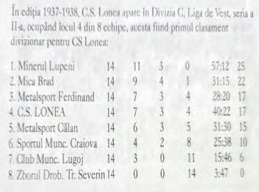 În campionatul 1937-1938, CS Lonea apare prima oară în Divizia „C”, Liga de Vest, unde ocupă locul 4 din opt echipe