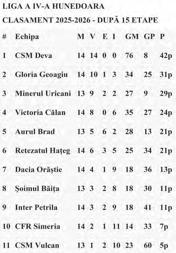 „Picată” din Liga a III-a, a renăscut din propria-i cenușă, având un procentaj de sută la sută în ceea ce privește punctele acumulate, cu 14 victorii din tot cu atâtea meciuri cu câteva înfrângeri, sunt pe podium Gloria Geoagiu și Minerul Uricani, dar cu puține șanse de a accede la primul loc Apoi vine grosul echipelor, unde spre coada clasamentului găsim ceke două echipe din Valea Jiului, Inter Petrila și CSM Vulcan, altădată ele făcând „legea”