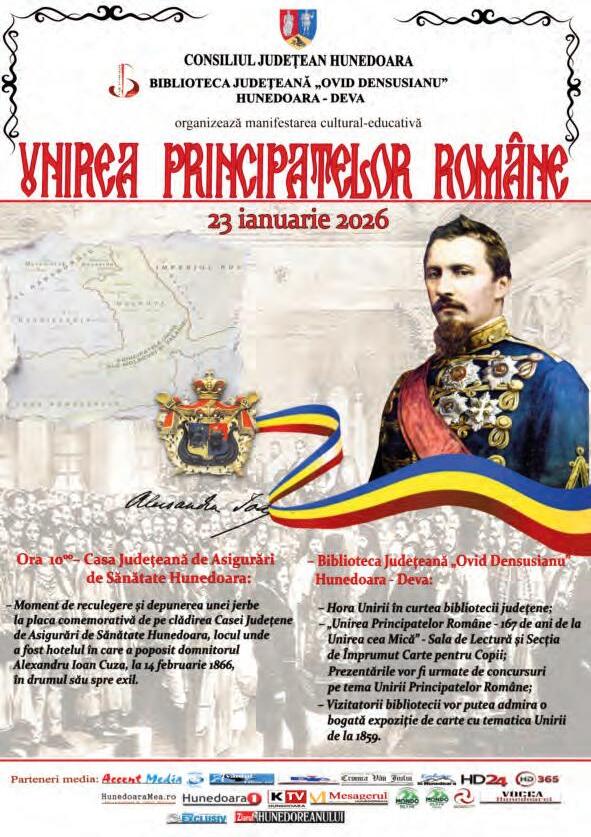 Județean Hunedoara și în parteneriat cu colegiile și liceele devene, organizează în data de 23 ianuarie 2026, ora 1000, o manifestare cultural-educativă menită să cinstească amintirea unuia dintre cele mai îndrăgite momente din istoria românilor: Unirea Principatelor Române de la 24 ianuarie 1859.