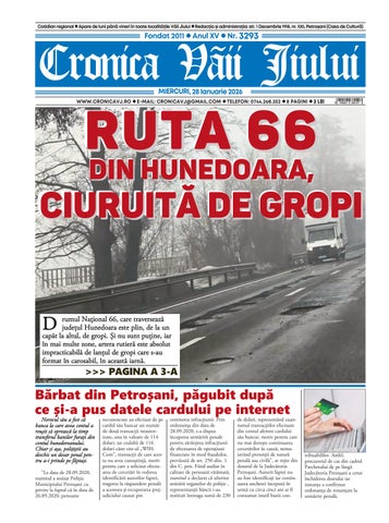 jude țul Hunedoara est e plin, de la un capăt la altul, de gro pi Și nu sunt puține, iar în mai multe zone , arte ra rut ieră este abs olut impracticabilă de lanțul de gropi care s-au format în carosabil, în aceast ă iarnă >>> PAGINA A 3-A R u t a 6 6 R u t a 6 6 din Hunedoara, ciuruită de gropi ciuruită de gropi R u t a 6 6 R u t a 6 6