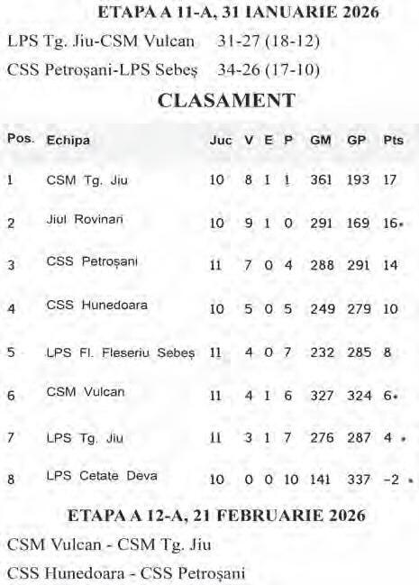 După ce în prima etapă a anului 2026 (a 10-a a campionatului) CSS Petroșani a c edat pe teren propriu, 2529 cu Jiul Rovinari, iată că echipa lui Alexandru Rotaru revine în forță pe linia victoriilor, c âștigând în etapa a 11-a clar cu scorul de 34-26 (17-10) în fața fetelor de la L PS Sebeș. Un joc dezinvolt, avân tat, c eea ce aduce echipa pe locul 3 în Seria L