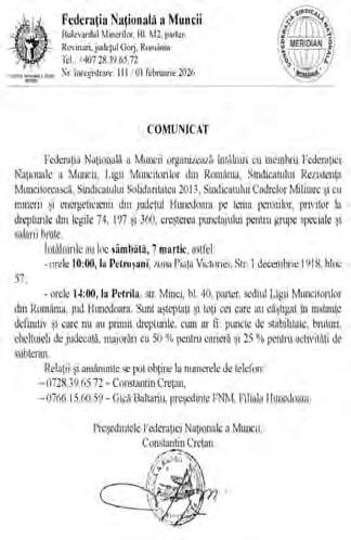 Vor fi discuții legate de posibilitatea de creștere a punctului de pensie, în baza legilor 74, 197 și 360, privind grupele speciale Întâlnirea va avea loc la Petroșani și la Petrila în ziua de 7 martie