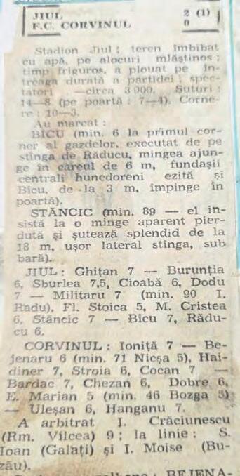 Meciul a fost arbitrat de Ion Crăciunescu (Rm Vâlcea). S-au aflat atunci, față în față, generațiile lui Ioniță, Nicșa, Bardac, Uleșan, Hanganu (Corvinul), Ghițan, Cioabă, Ov Dodu, Militaru, Fl Stoica, M Cristea, Bâcu (Jiul)