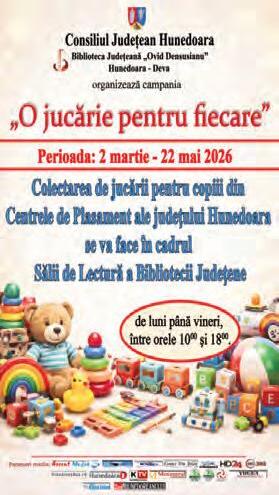 Bibliotecii Județene „Ovid Densusianu” HunedoaraDeva, cu sediul în municipiul Deva, str 1 Decembrie 1918, nr 26, unde se va afla un centru de colectare a jucăriilor, în perioada 2 martie – 22 mai 2026, de luni până vineri între orele 10 00 și 18 00 Prin această inițiativă îi chemăm alături de noi pe toți cei care vor să le dăruiască un strop de bucurie acestor copii vitregiți de soartă
