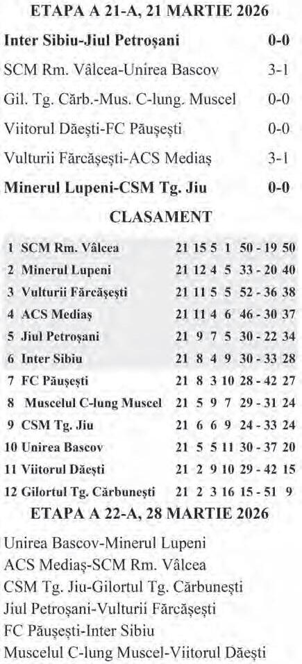 în Seria a 6- a, lucrur ile s-au așezat aproape sută la sută mine rul lupeni m ai poate pie rde doar locul 2, dacă nu î nvi nge la Bascov, iar Vulturii Fărcășe ști câști gă la petroșani Sau la fel dacă acS mediaș î nvi nge pe Scm rm Vâlcea dar oricum , e ste în play -off
