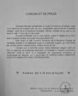 Sindicatul Muntele, organizație repreze ntativă la n ivelul Complexului Energeti c Vale a Jiului, și-a expri mat public solidaritatea față de protestele angajați lor din Complexul Energetic Olte nia, acțiuni care au avut loc și vor continua atât în județul Gorj, cât și în București