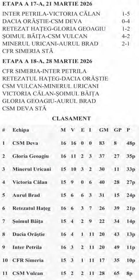 Șase goluri în meciul Șoimul Băița-CSM Vulcan 4-2 Gazdele au condus cu 3-0 (autori Adr Drăgan, Marcovici, Ticula) apoi a fost 3-2 (Vamoș, Marioane), golul de 4-2 fiind marcat de Elias Benel
