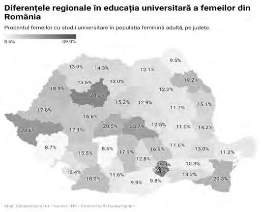 fenomen constant: femeile din România sunt mai educate decât bărbații În segmentul de vârstă 25–64 de ani, raportul este de 21% față de 17% în favoarea femeilor, o diferență care se păstrează în toate generațiile