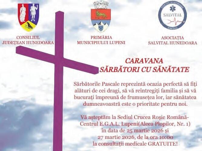 „Caravana „Sărbători cu sănătate” ajunge la Lupeni pe 25 și 27 martie 2026 Asociația Salvital Hunedoara, cu sprijinul Consiliului Județean Hunedoara și al Primăriei municipiului Lupeni, organizează caravana medicală „Sărbători cu sănătate” la sediul Centrului EGAL al Crucii Roșii Lupeni, de la ora 10,00”, anunță cei de la Salvital Hunedoara În cadrul acțiunii se vor efectua GRATUIT următoarele proceduri medicale: