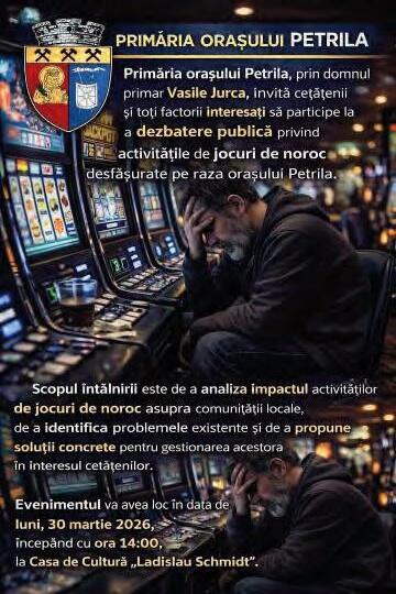 Primăria orașului Petrila, prin primarul Vasile Jurca, invită cetățenii și toți factorii interesați să participe la o dezbatere publică dedicată activităților de jocuri de noroc desfășurate pe raza localității