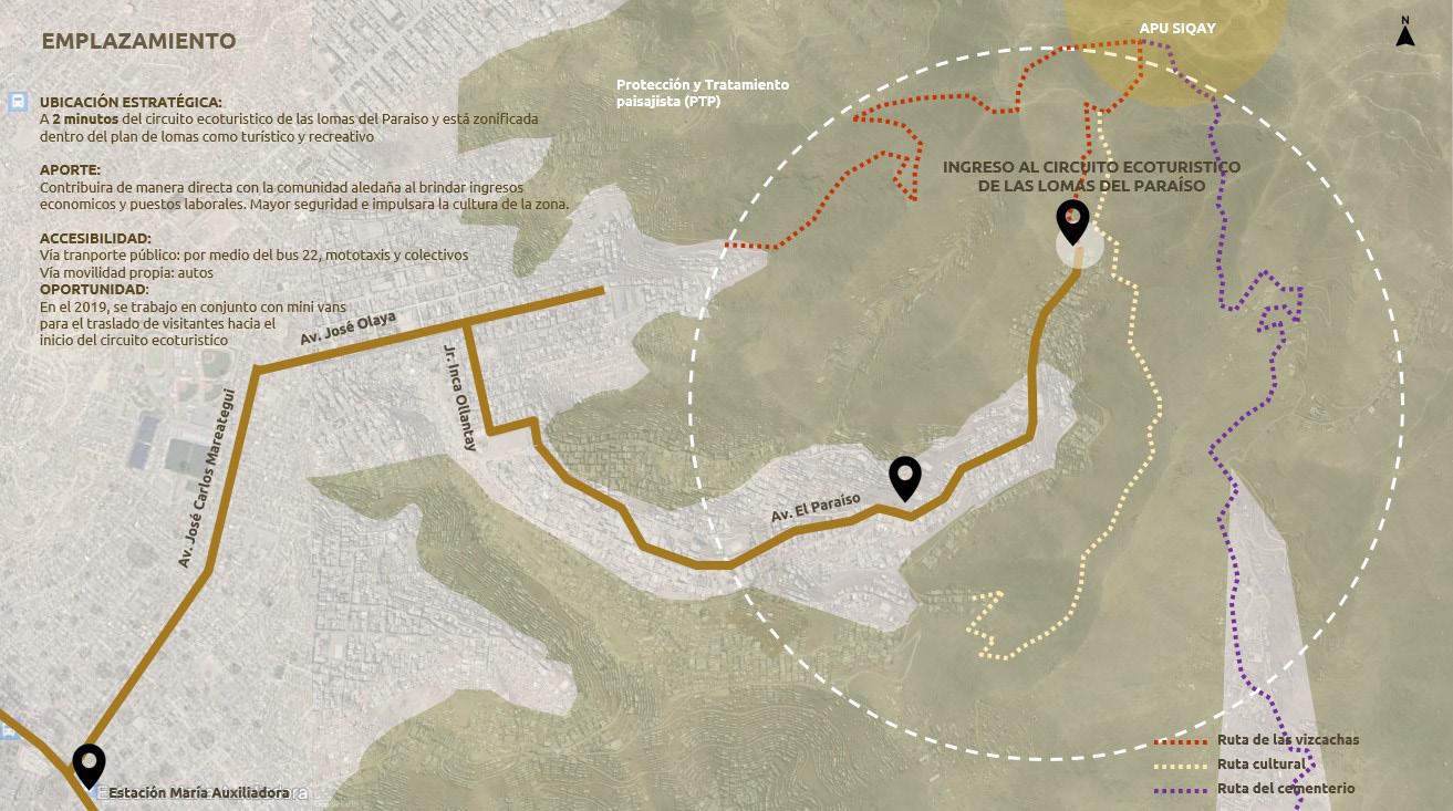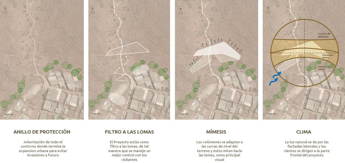 El proyecto se emplaza al inicio del recorrido ecoturístico, siendo la “puerta” que te invita a conocer las lomas, pero al mismo tiempo actúa como un muro de protección para evitar las futuras invasiones que depradan las lomas. Para ello, se tuvo el énfasis de la mímesis arquitectónica, ya que al estar en una zona protegida, el proyecto no debe competir con el patrimonio natural, sino al contrario exhibirlo.