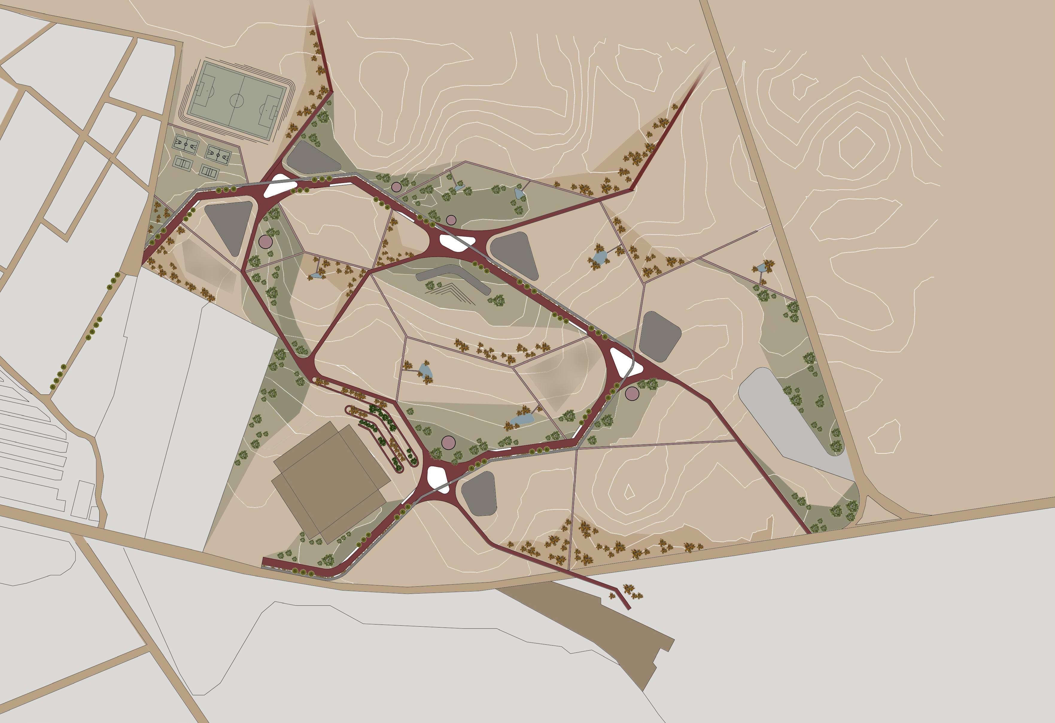 Implementar zonas de mantos verde y vegetación, así como zonas de espacios áridos dejando zonas del terreno actual como lagunas. Buscar el contraste de ambas.
