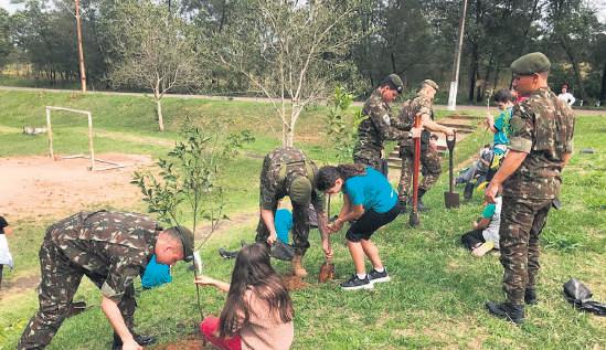 Estância Velha - Para celebrar o Dia da Árvore, comemorado nacionalmente em 21 de setembro, a Prefeitura de Estância Velha, por meio da Secretaria de Meio Ambiente, Agricultura e Pecuária (Semapa), e em parceria com 19º Batalhão de Infantaria Motorizado do Exército, de São Leopoldo, realizou uma atividade especial com os alunos da Escola Municipal de Ensino Fundamental Prefeito Reinato Trein. Na quinta-feira, dia 19, alunos e membros do batalhão realizaram uma atividade de plantio de mais de 50 mudas de árvores.