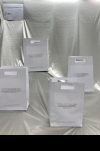 A trial selling experience was conducted with these four mended garments. The garments were packaged in a luxury-style manner They each ed had their own dustbag and tissue paper wrapping They were placed in white paper bags that had a description of the item inside (figure 10) This way, people could read and choose which garment they would buy based on the story of the garment (figure 11) rather than what the item looked like This method provides an innovative selling experience, unlike anything that people experience nowadays It makes getting the garment a bigger adventure and draws people to buy these as it is something unknown and unexpected At the same time, it doesn’t foment excessive shopping practices as people are not likely to buy tons of unseen garments. Human’s relationship with the unknown and intrigue is what drives them to be interested in this process but is also what prevents them from going overboard