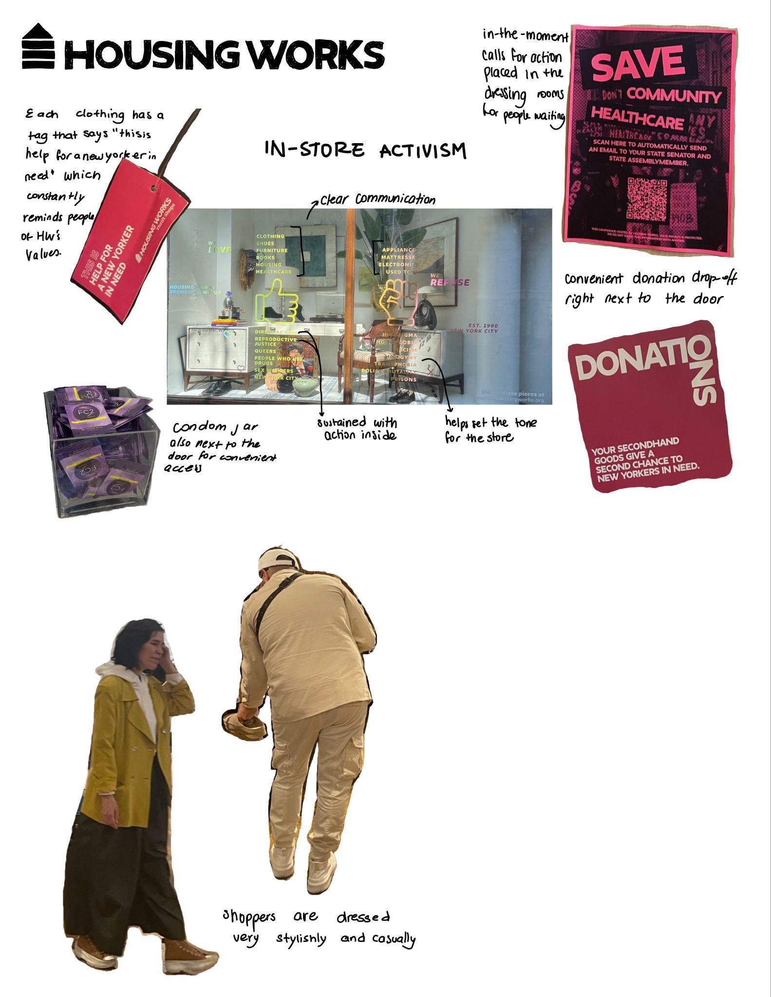 notable aspect of the store is that their activism and social work are reminded to the customer throughout the entire shopping process From the store’s window displays to the tags on clothing, people are constantly reminded that buying a garment from Housing Works is not just that, it is helpful for communities and people in need. It was also useful to see how people relate to used garments and what they look for at thrift stores Most clients were making comments on a garment’s brand or were looking for products that were originally from a reputable brand. Shoppers averaged around 30-35 years old and they were all dressed very stylishly but the clothing offered was more referential to older generations It was a commercial reference to what hand-me-downs are like in a family.