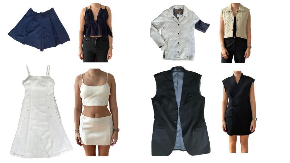 The final garment used is a sample knit dress from Express (figure 9). This garment was completely torn on the sides but in perfect condition everywhere else The sides were sewn back together and then the dress was separated into two pieces to form a top and skirt set (figure 9). Although this didn’t use any additional materials, it did require an overlock and cover-stitch machine to ensure the correct finishings for knit materials These machines are not readily available and should be accounted for. The process took 1:30 hs which shows it is a fast and easy way to change the style of a garment This could be a great option for long evening dresses which are generally worn for a single occasion and never again.