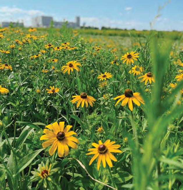 Next to the solar field is the 34-acre Jiri-Rita Prairie Park, which officially opened to the public with a formal dedication and communitywide celebration. This reconstructed and highly diverse native prairie, which includes walking paths and interpretive signage, will establish and support a diverse native habitat for birds, butterflies, insects, reptiles, and small wildlife. It will also serve as a rest stop for monarch butterflies that migrate to and from Mexico each year. Additionally, the prairie will sequester about 170 metric tons of carbon dioxide (CO2) annually, helping mitigate the effects of greenhouse gases in the environment.