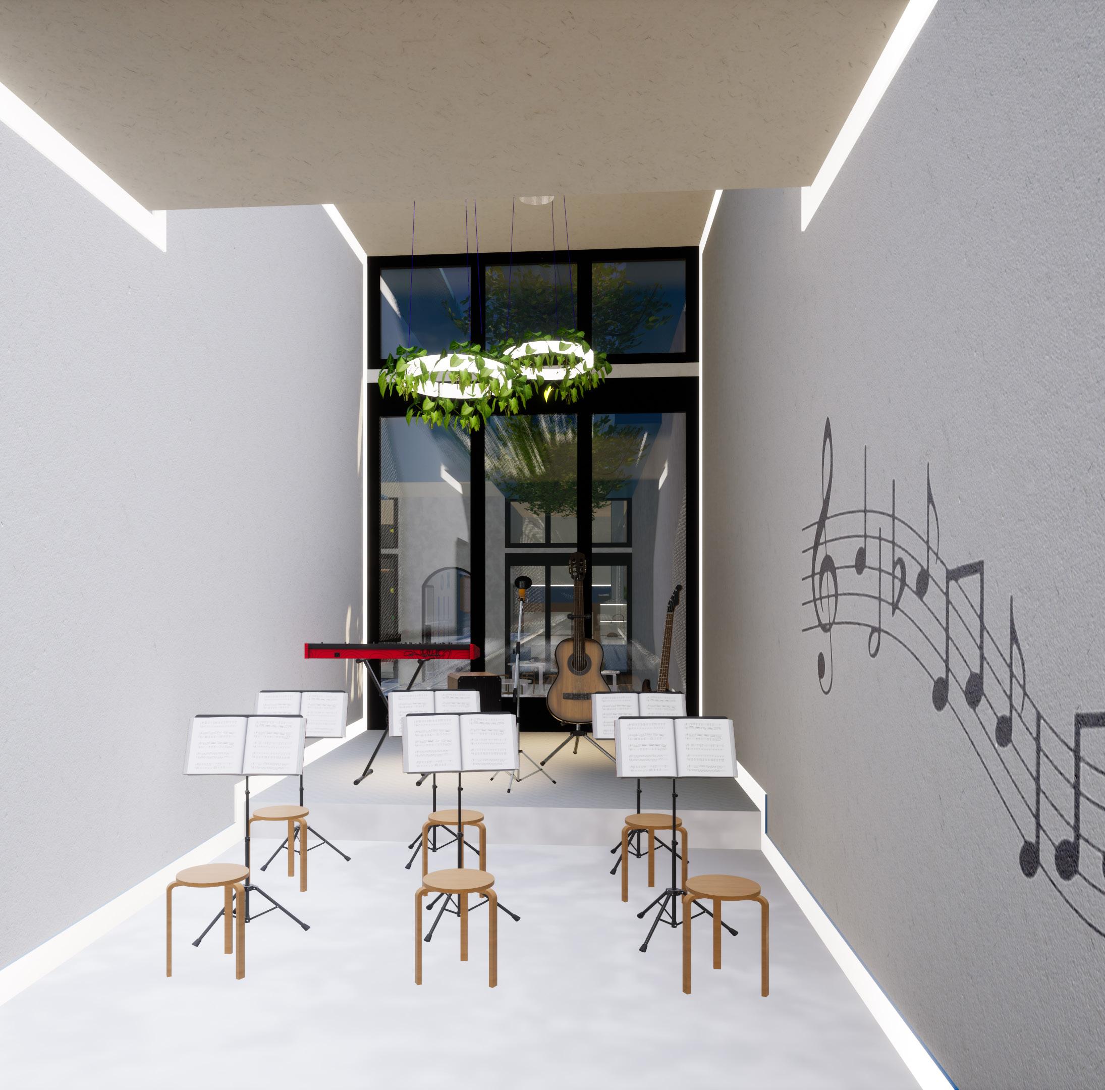 A nivel de piso encontramos la cocina, zona de estudio, zona de charla y una zona exterior. Mientras que sobre la plataforma, podemos encontrar la zona de juegos y el escenario.