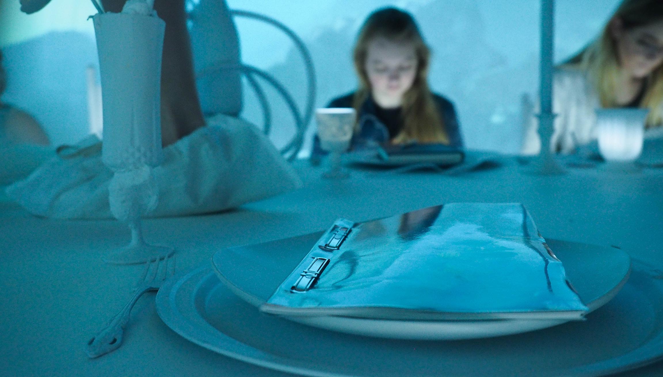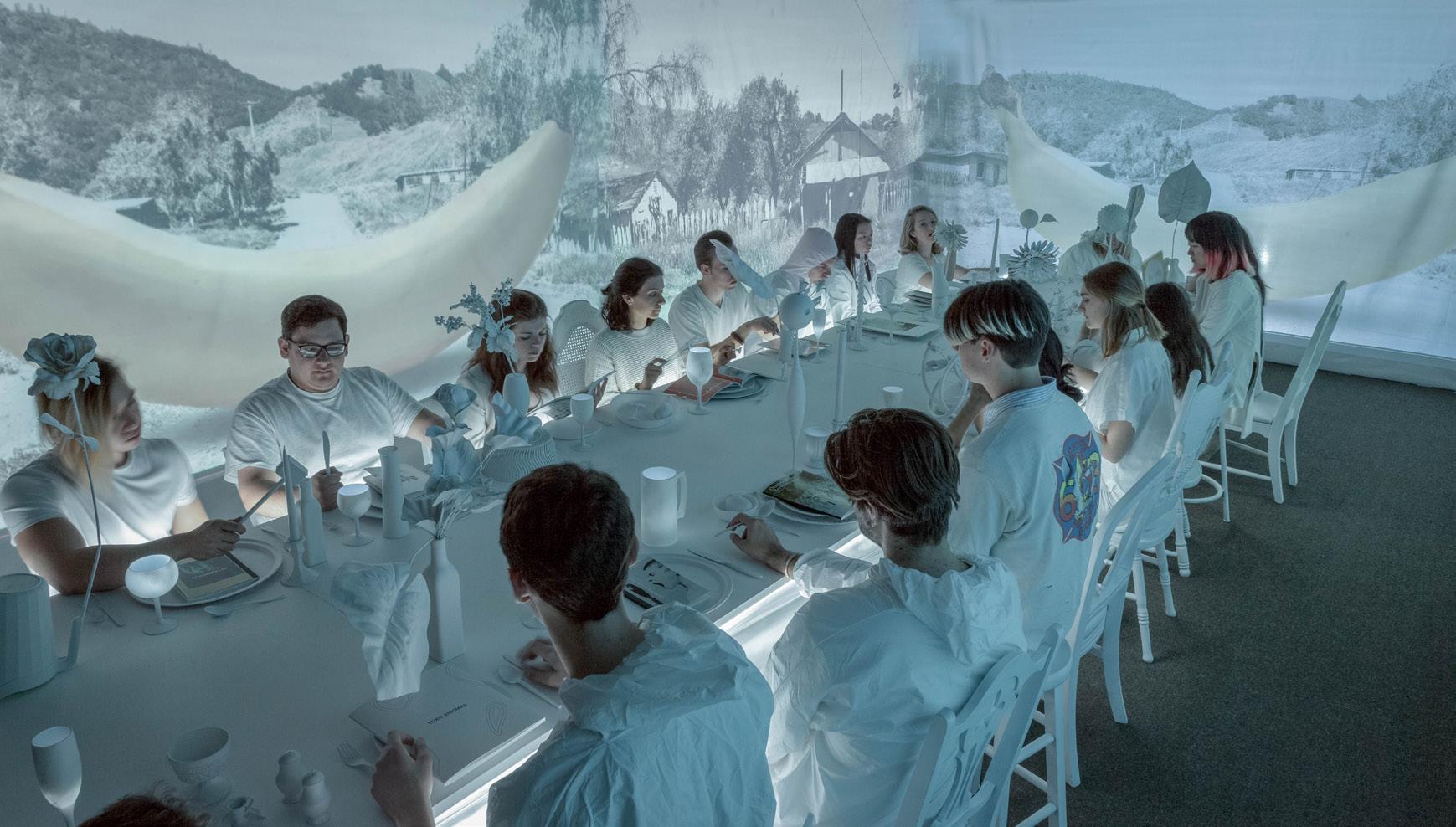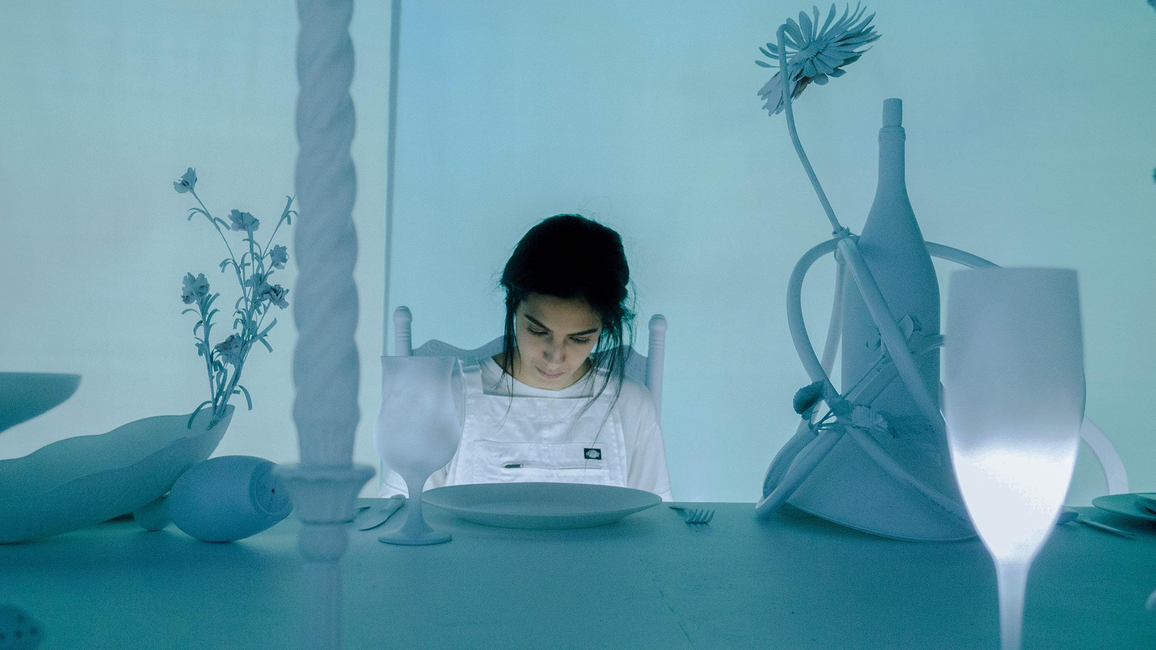 The space morphs into different realities through the use of projections of different landscapes, providing different light quality, which constantly changes the overall mood of the space. The dining table is also decorated with varied white paraphernalia to add to the surrealist effect of the space.