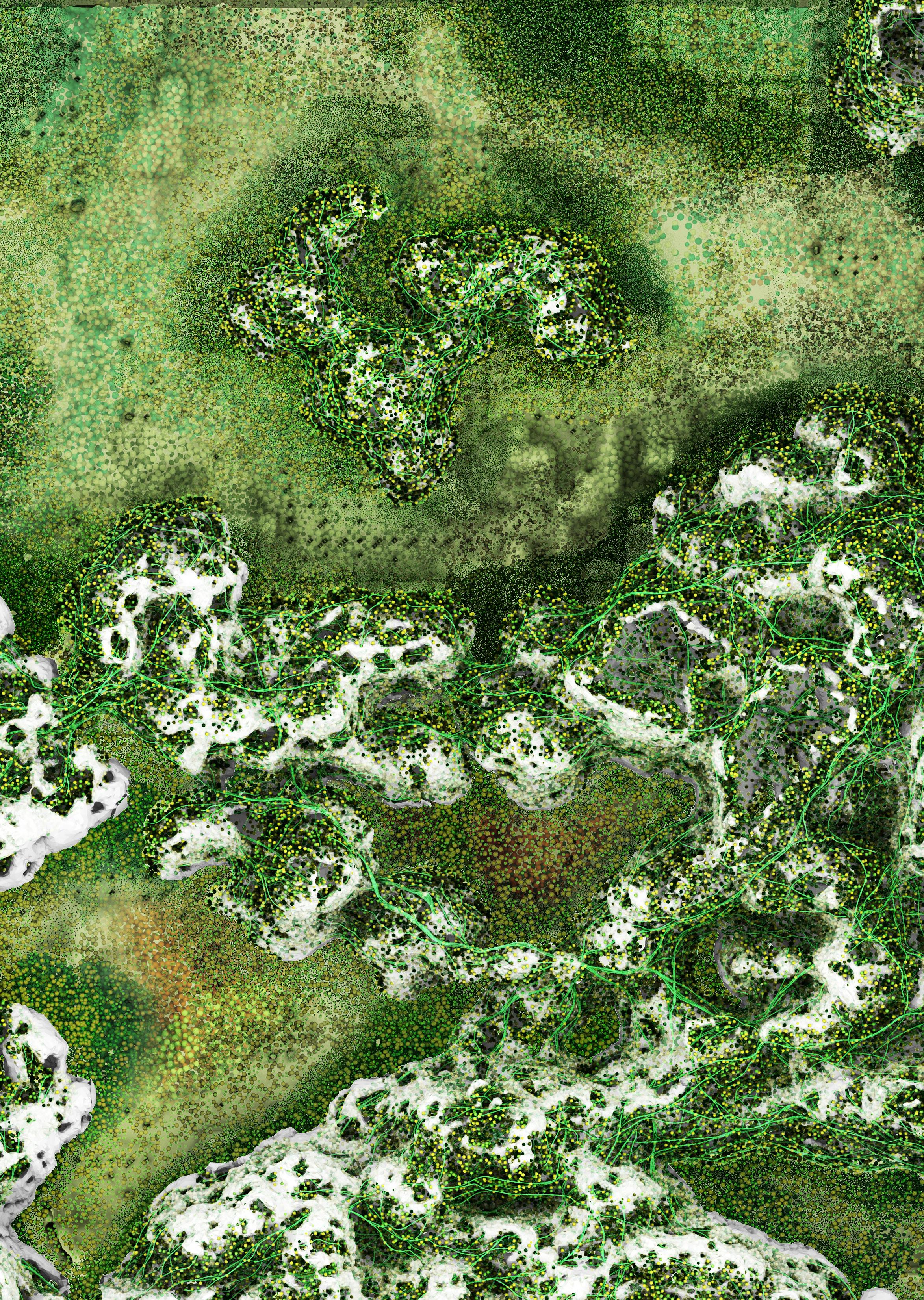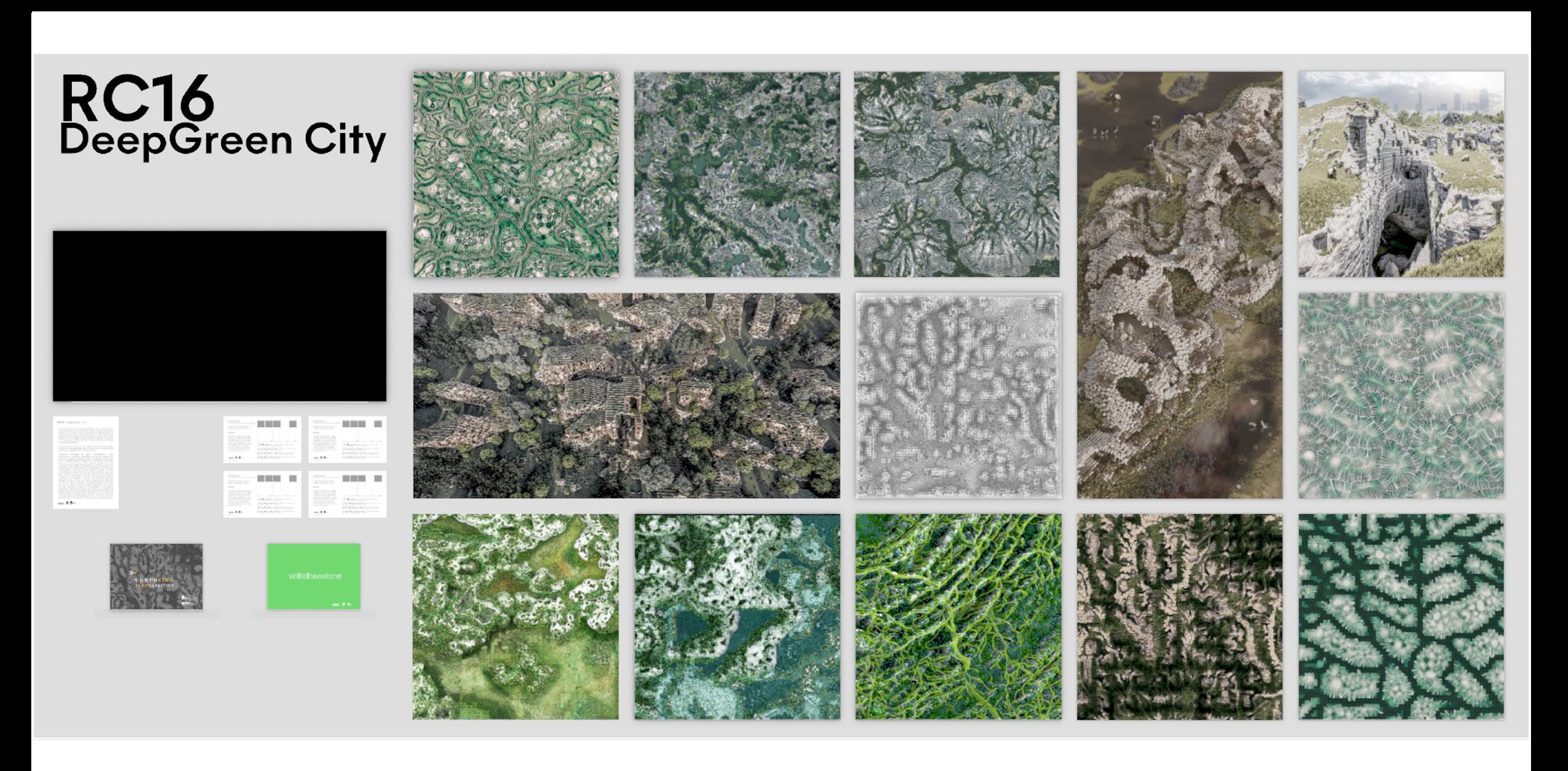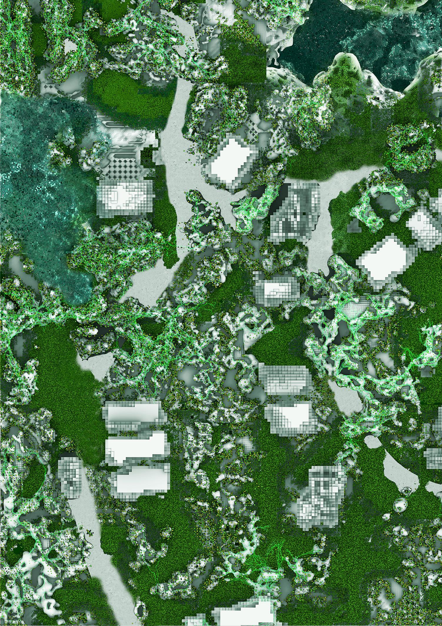 Our group's thesis project, VoltaicEcotone, a bioenergy infrastrutcute, showcases a series of four drawings - one a close up of the bio-digital substrate for the infrastructure implemented, an aerial view of aquatic and woodland typologies, and the urban morhogenesis of London.