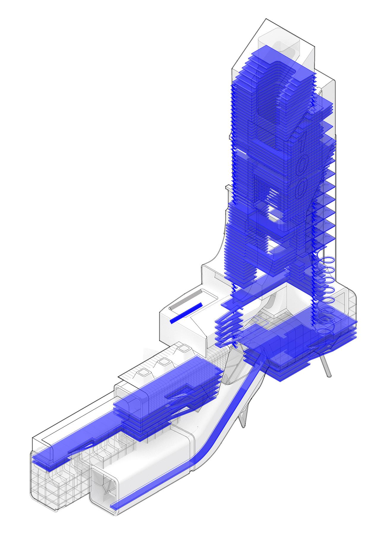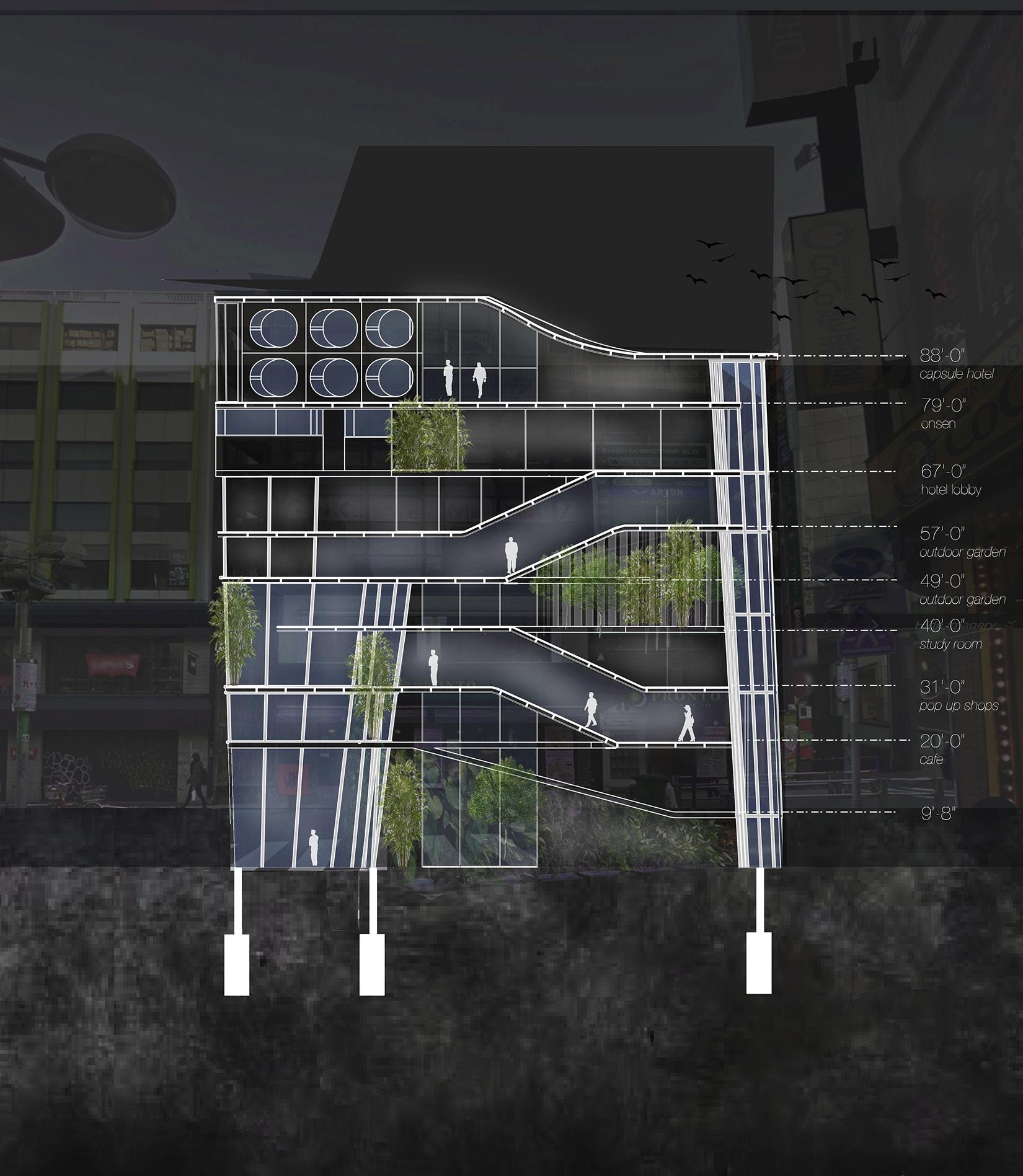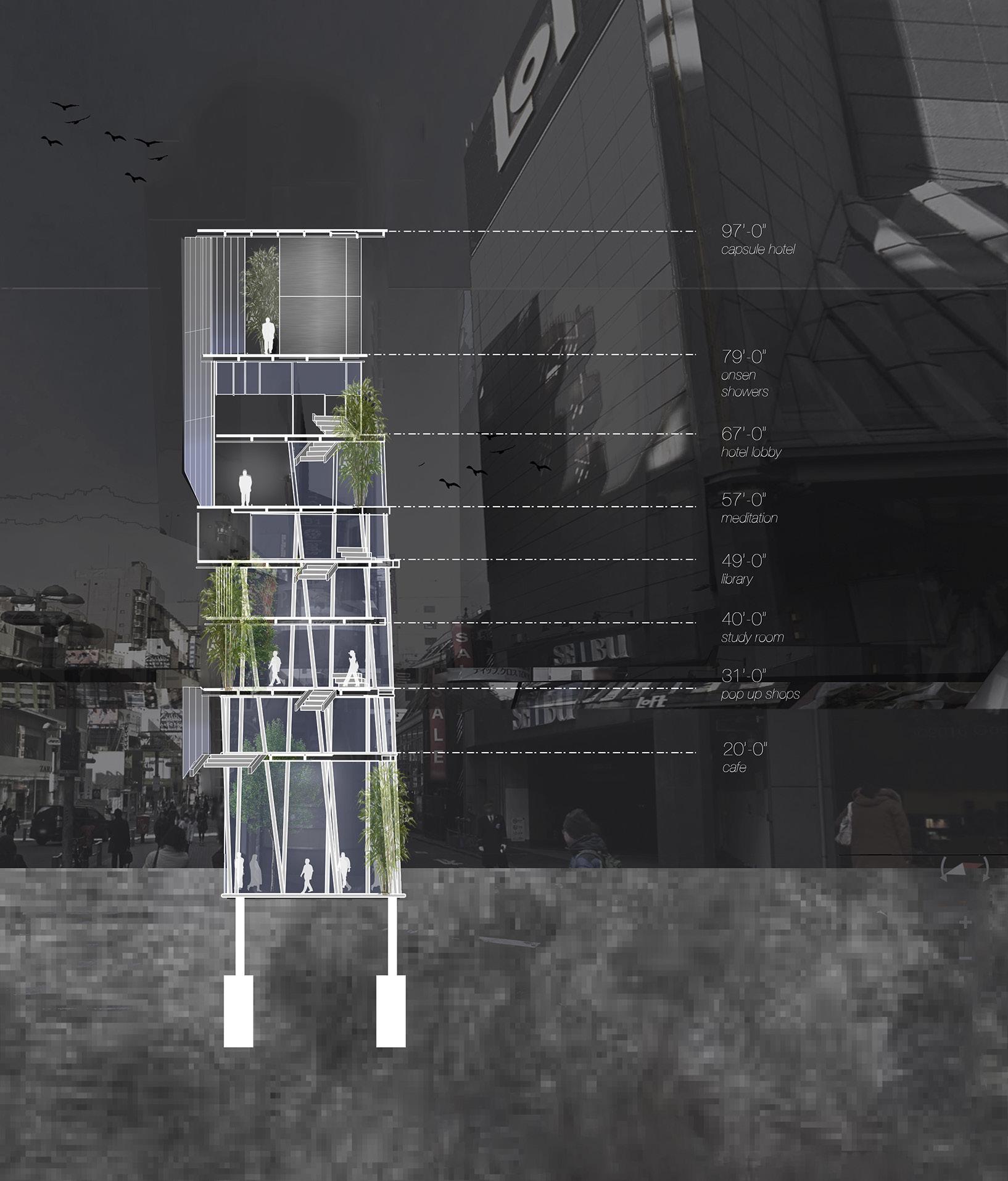 The center provides a place of refuge, which acts as a sanctuary and meditative space from its extremely densified urban context. The building provides study rooms, a library, meditation and yoga rooms, and a capsule hotel for less transient visitors. The building also houses an interior garden in order to have direct access to natural elements. The user weaves through a series of program spaces which start as shared, public space and eventually lead to individual, private space on upper levels.
