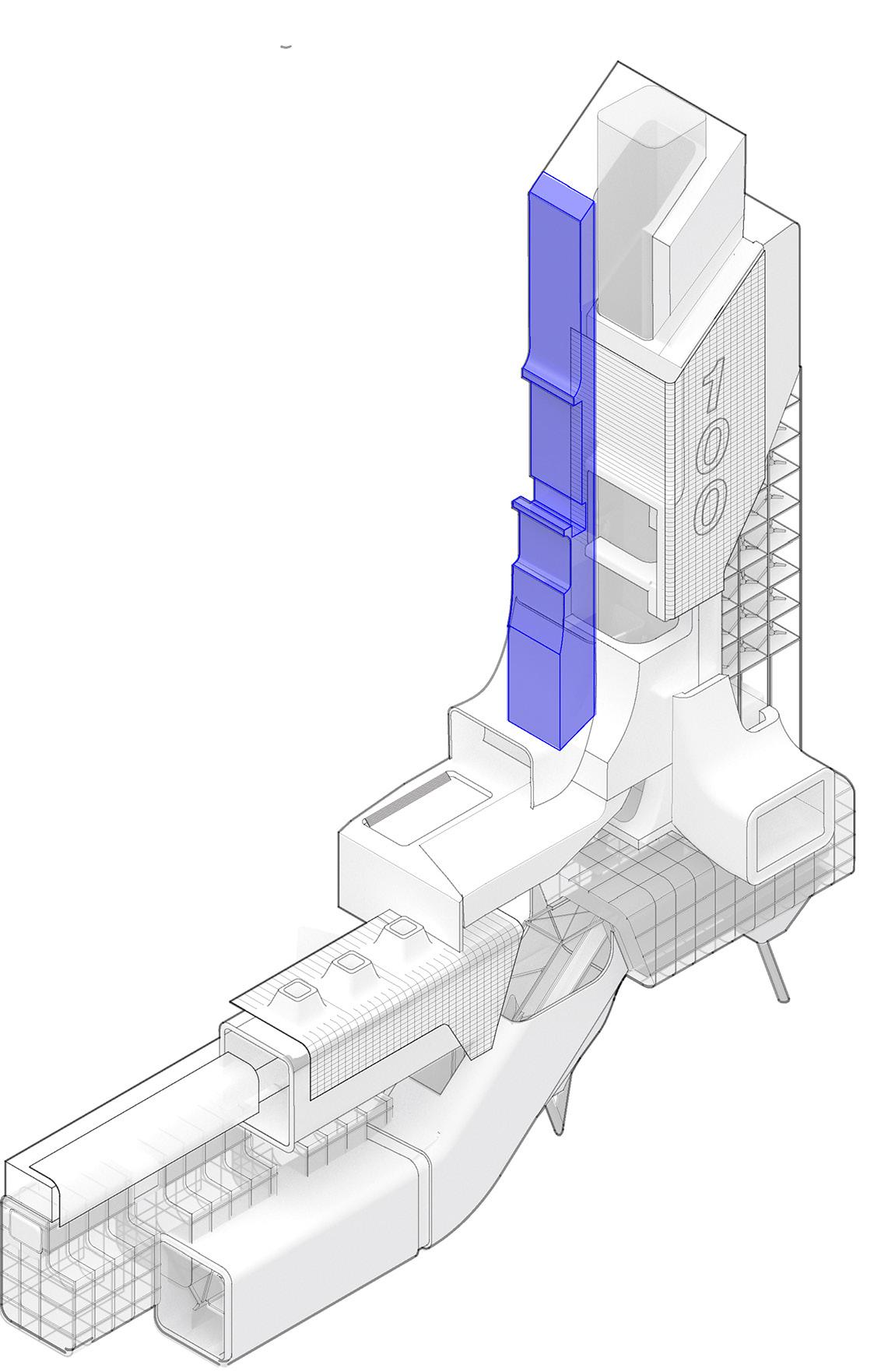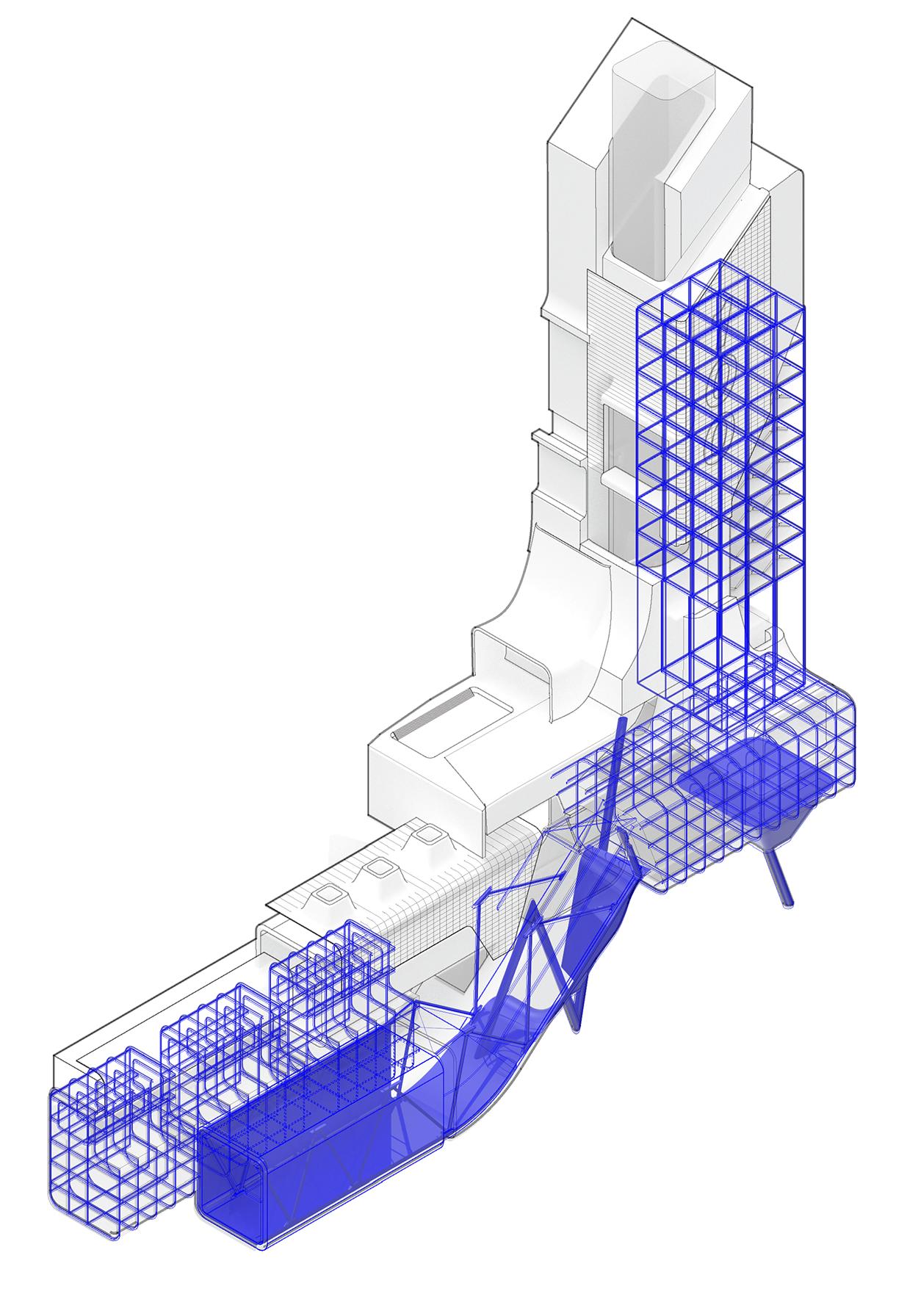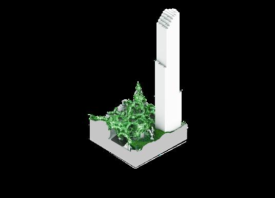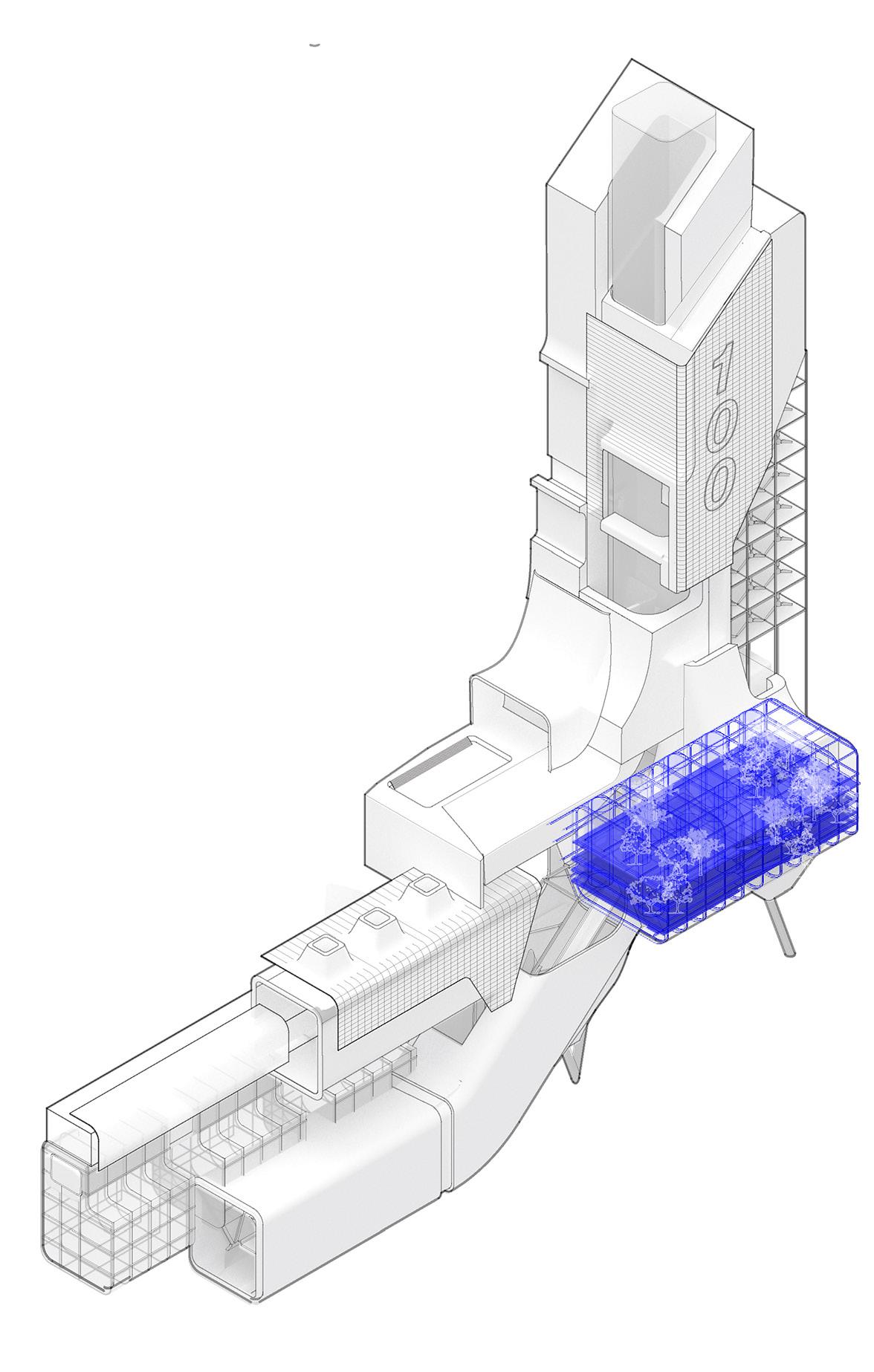 The center provides a place of refuge, which acts as a sanctuary and meditative space from its extremely densified urban context. The building provides study rooms, a library, meditation and yoga rooms, and a capsule hotel for less transient visitors. The building also houses an interior garden in order to have direct access to natural elements. The user weaves through a series of program spaces which start as shared, public space and eventually lead to individual, private space on upper levels.