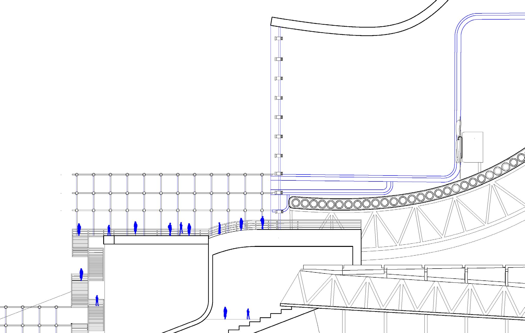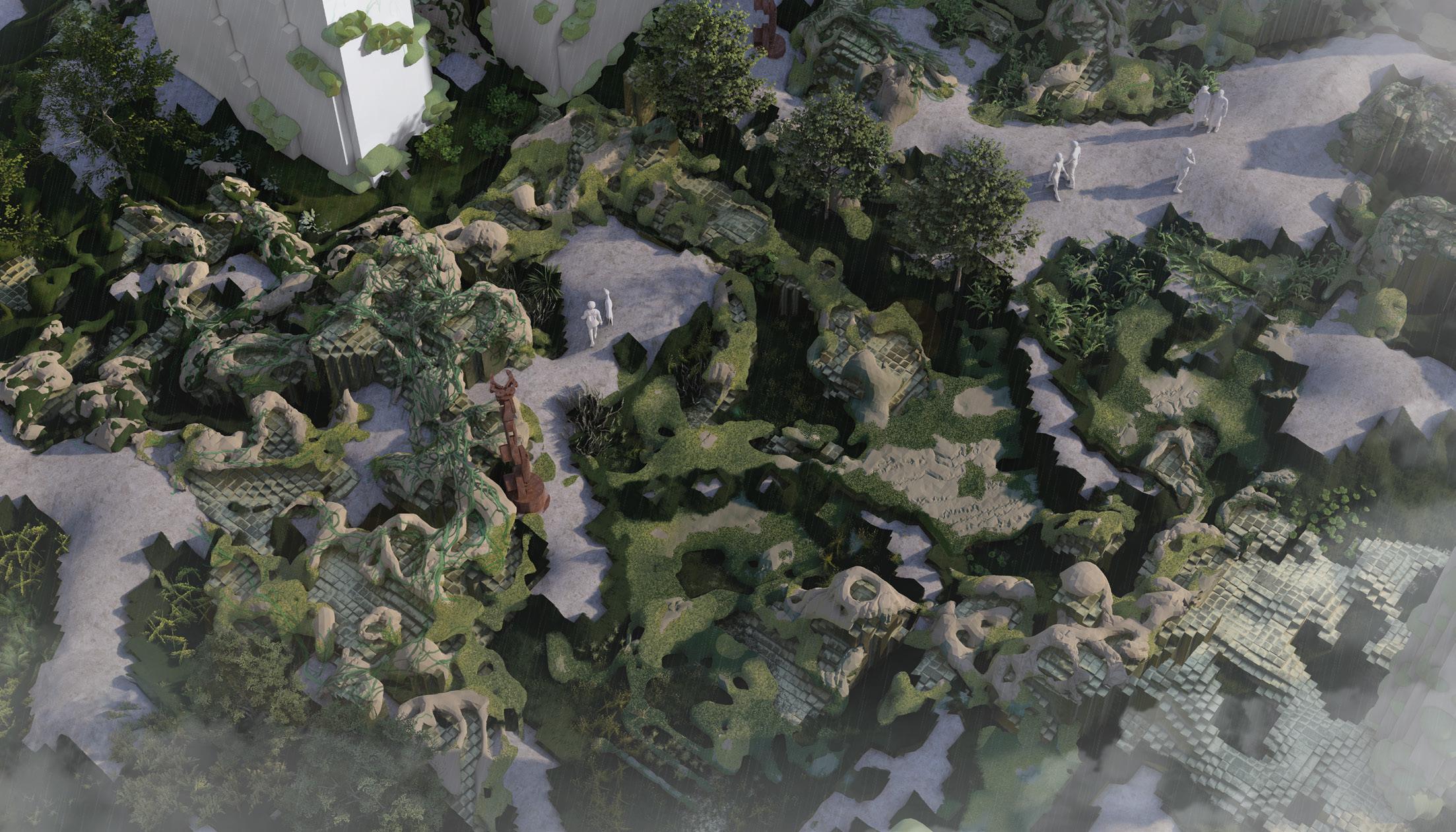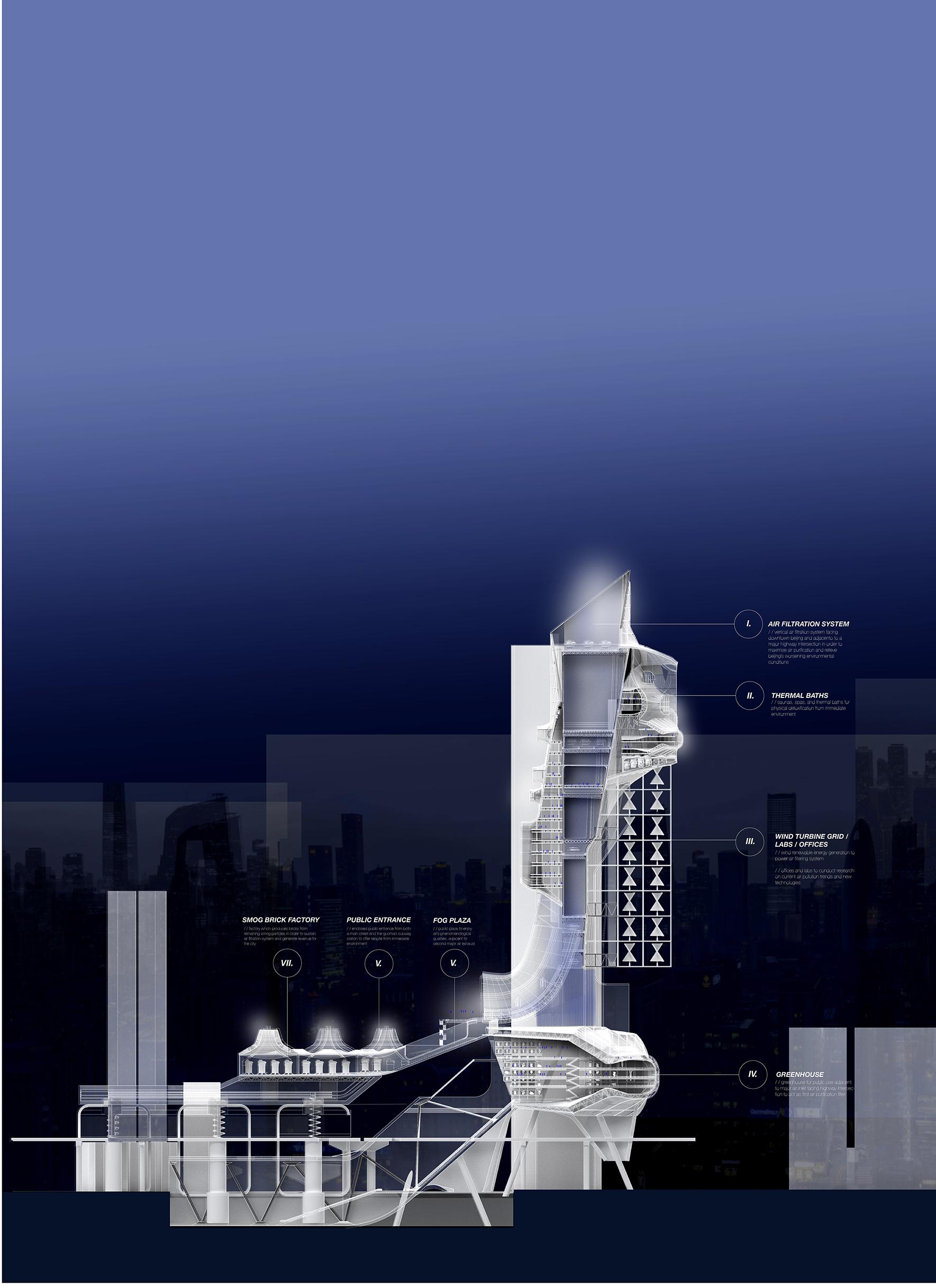 The air filter is coupled with a mixed use facility easily accessed underground through a major transit hub in order to provide the public with refuge from the exterior conditions. The air filtration structure is meant to be a prototype to be placed on each intersection of the five main ring highways in Beijing, with some contextual adjustments, in order for this issue to be addressed at an inter-city scale.