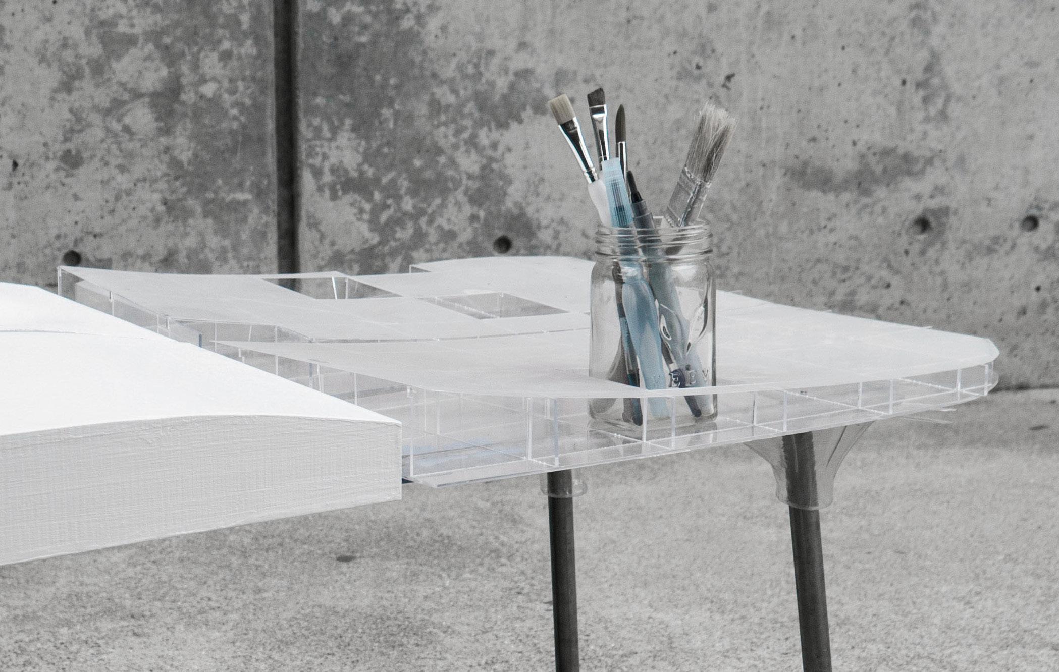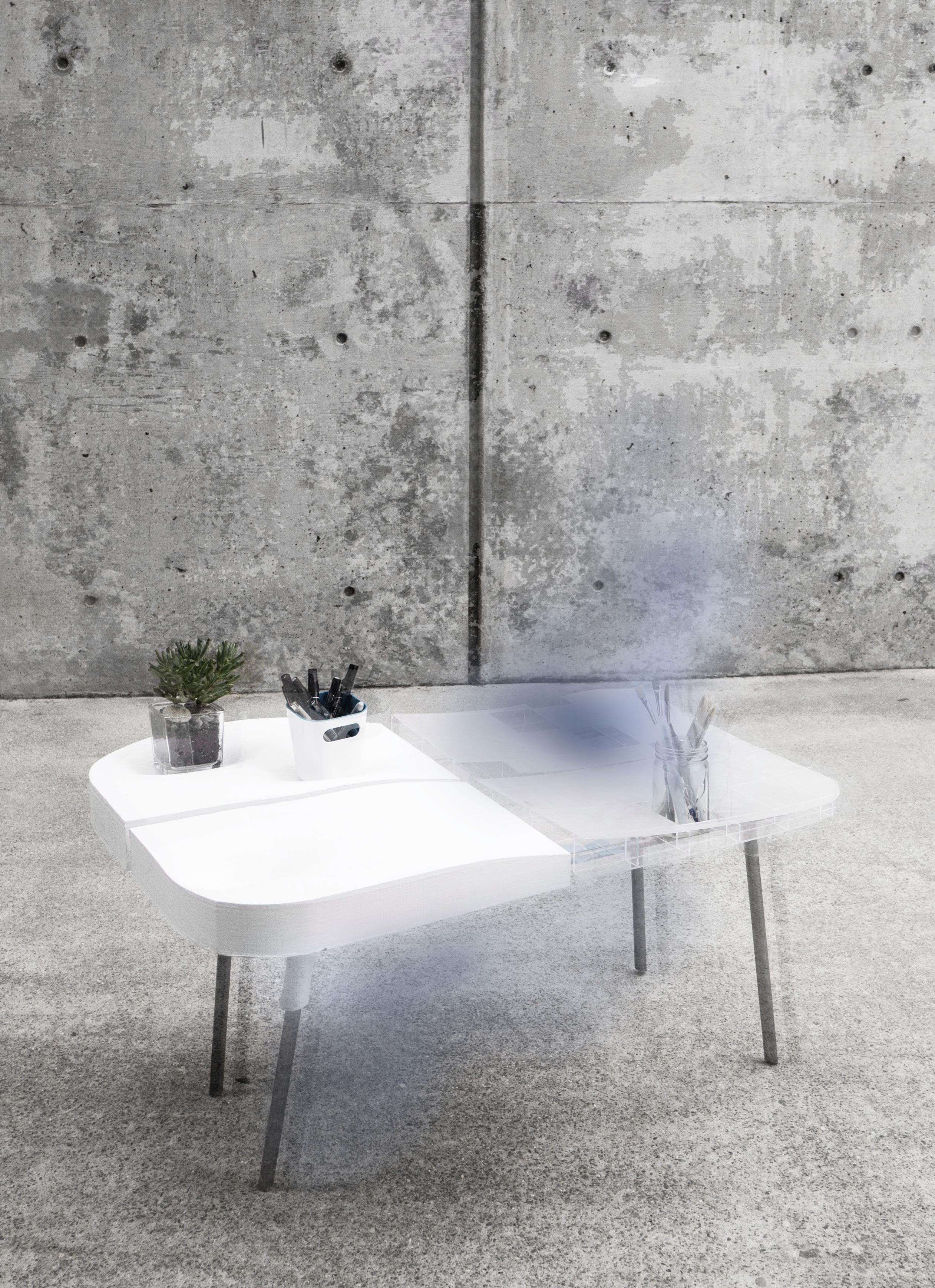 The acrylic section is lasercut to form a grid onto which an undulating plastic top is adhered to, and the solid, blob-like section is created by laminating sheets of MDF, which are then CNC milled and sanded. The solid section is coated in primer and white paint to achieve the final finish. The legs are also crafted to be half-transparent, half-white in order to look as an intrinsic part of the table top.