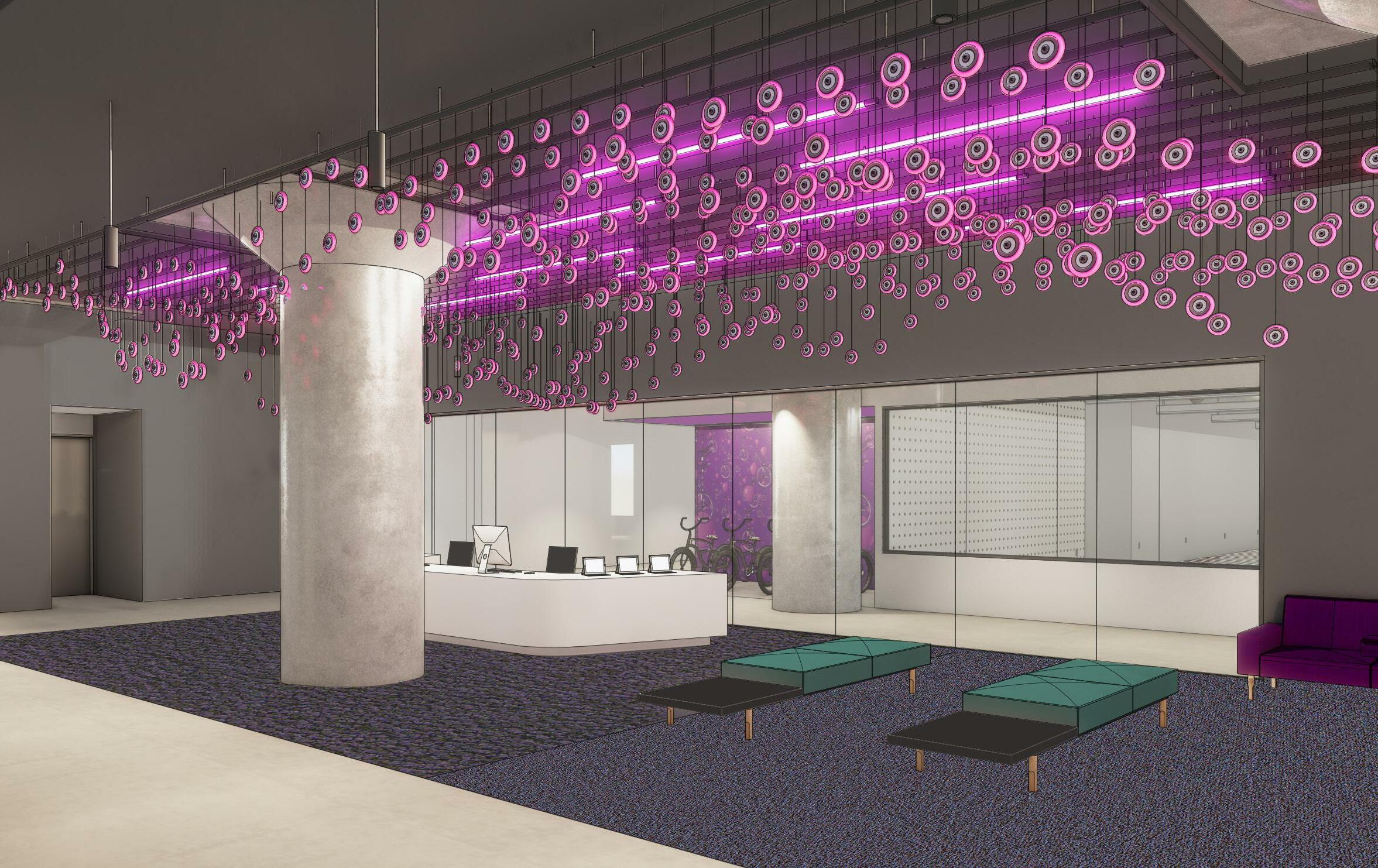 The ceiling installation is composed of pink scooter rims from Lyft's scooters. The installation references various different cycloid patterns, which change depending on bike velocities.