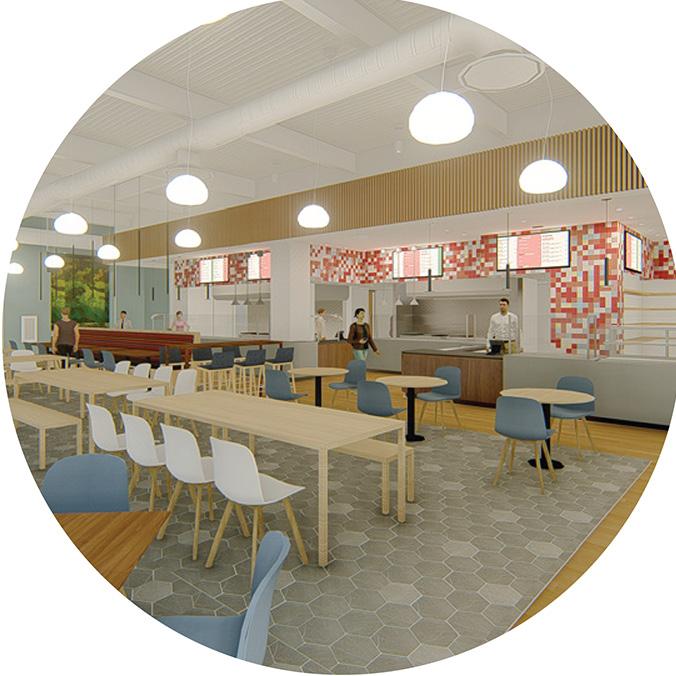 The interiors are rich in color and materiality, which serve to break up the scale in a modern, open space plan. The hub houses a dining hall with a servery composed of different wood laminates and cement -like solid surfaces to indicate different food programs available. A series of drop ceilings hang over the lounge, event space, and prefunction areas, which highlight usage of space below.