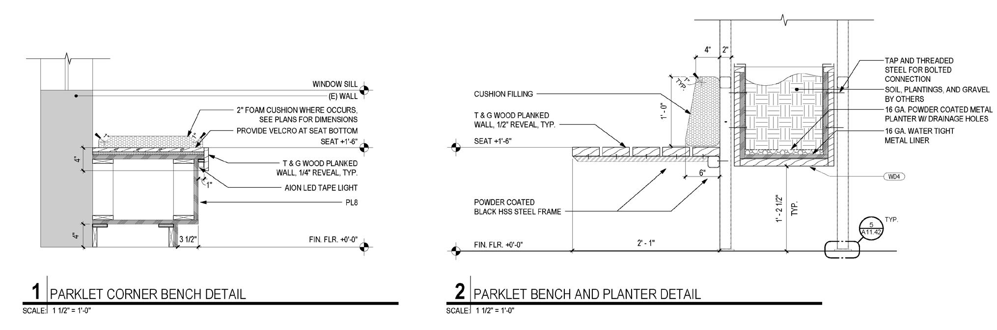 The indoor parklet design consists of an integration of structure, millwork, and landscape design through seamless collaboration and coordination with structural engineers, millworkers, and metal fabricators. The design is based on the highline, with tiers of perimeter planters and benching held by a single structural element.